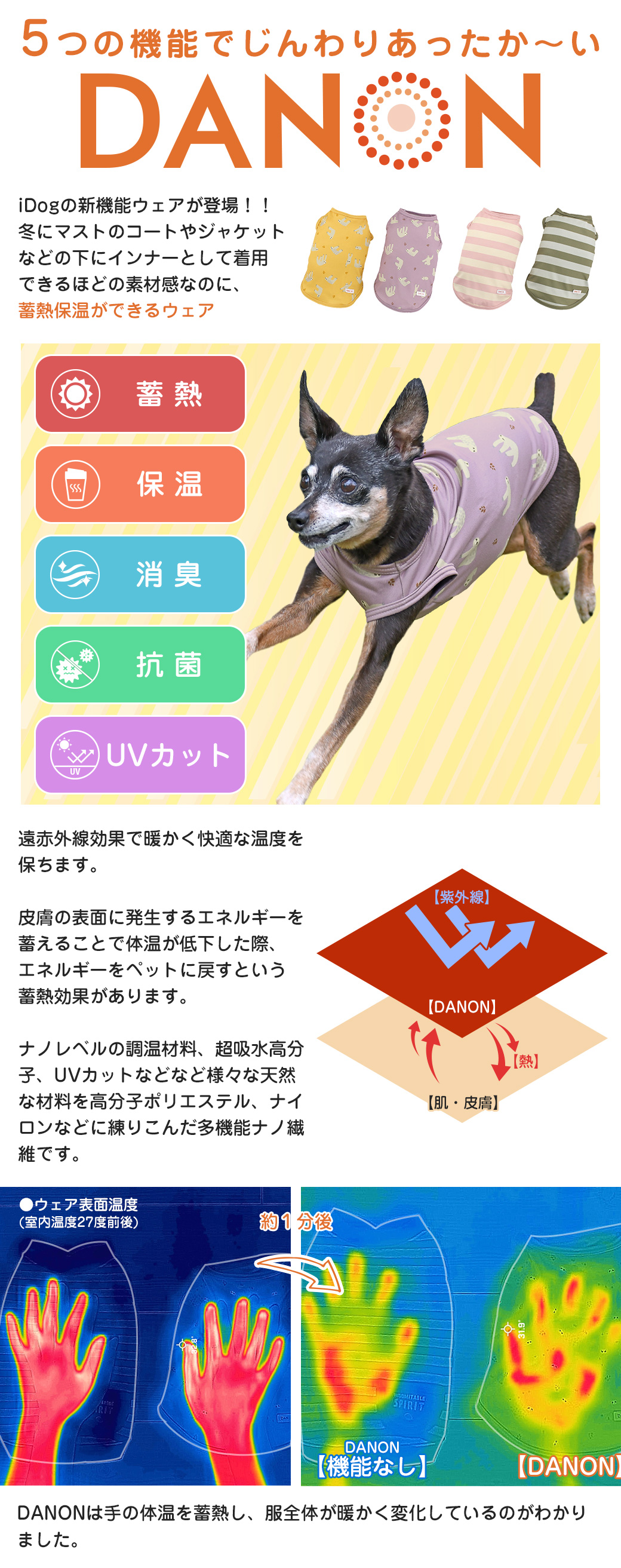 遠赤外線効果のあるナノ粒子を含んだ繊維を使用。iDogの新素材でぽかぽか暖かい。