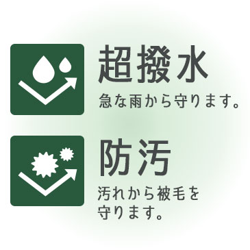 急な降雨に対応できる最新の機能加工により超撥水製と従来のレインウェアにはない軽い着用性とペットの動きに対する追従性を実現しました。