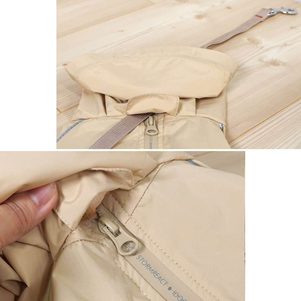 フードはスヌードタイプです。愛犬の頭に合わせてストッパーで調整してください。