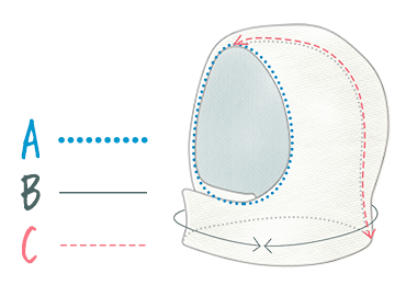 | サイズ(cm) | A顔周り | B首周り | C後頭部長さ |