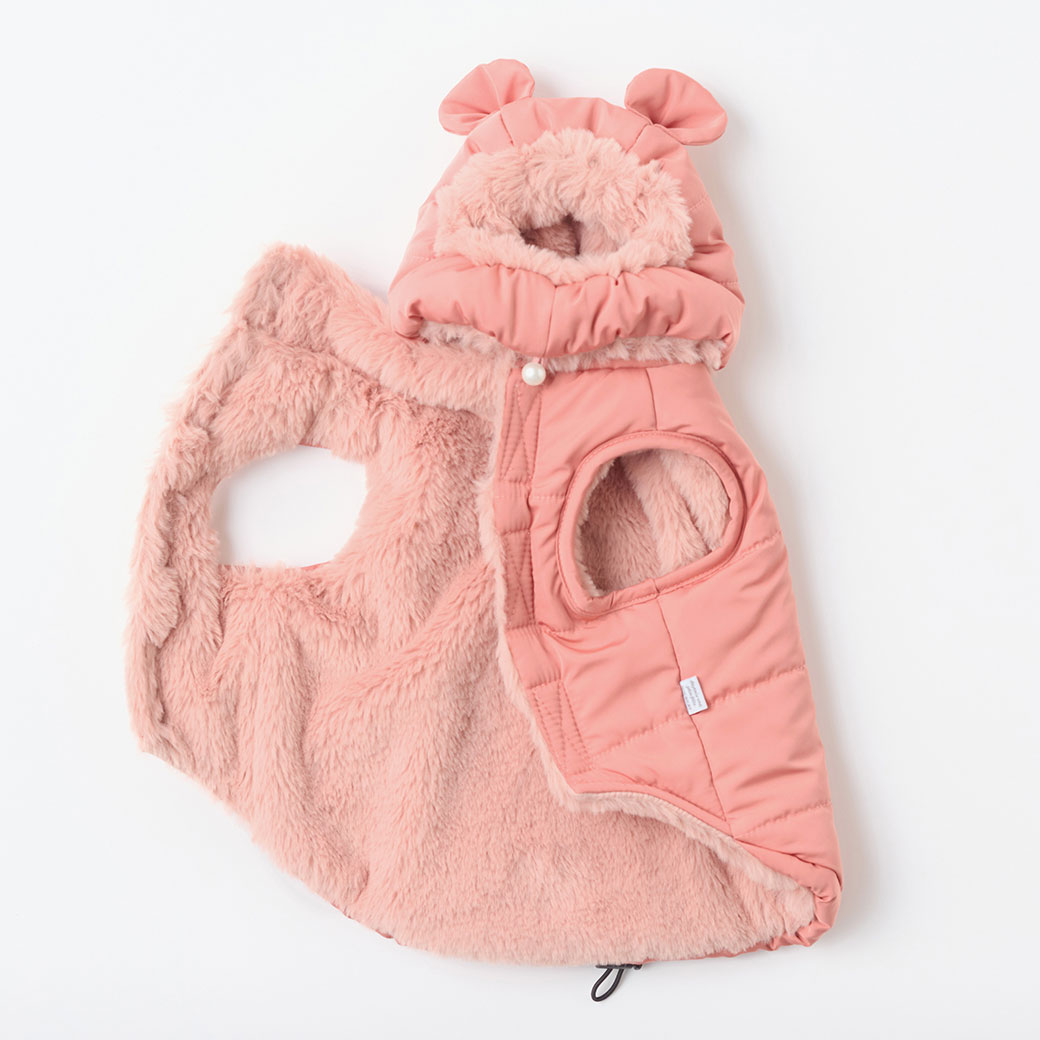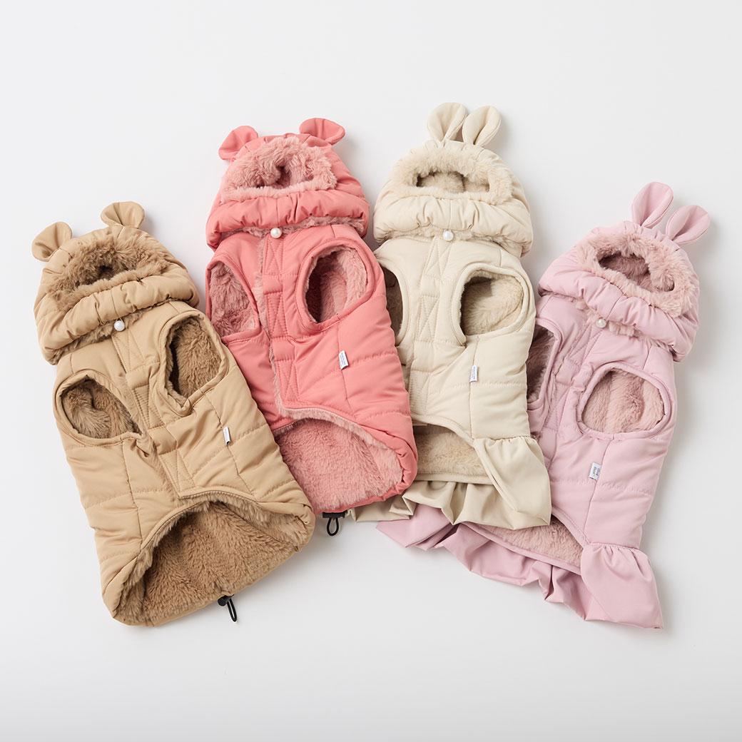 くま耳・うさ耳付きのかわいい犬用ダウンコート。