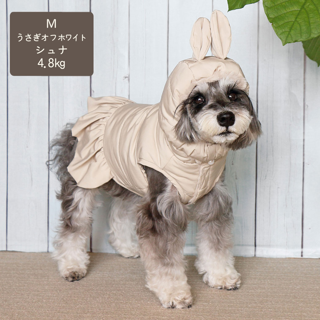 ミニチュアシュナウザー4.8kg(首22/胴39/丈29cm)のあろあちゃんはうさぎオフホワイトのMを着用