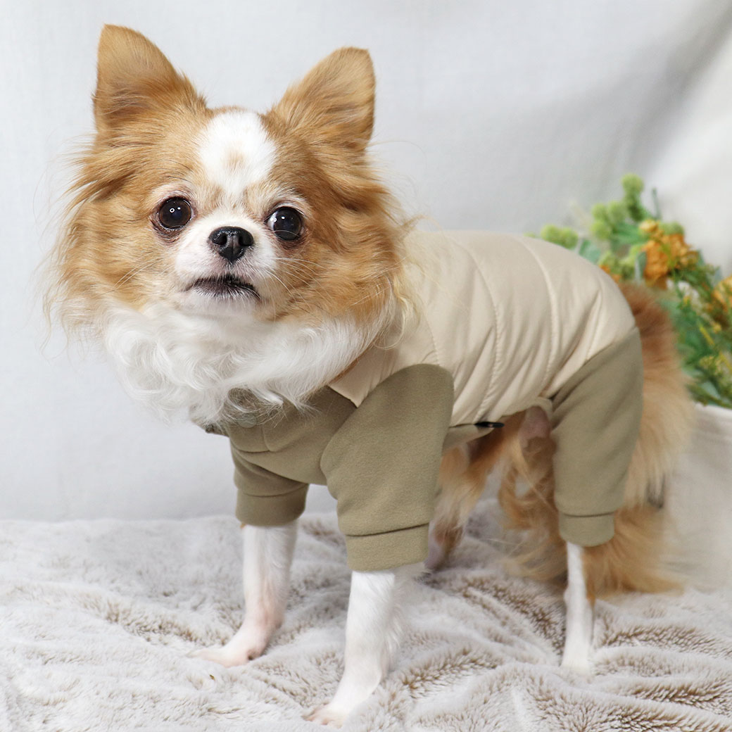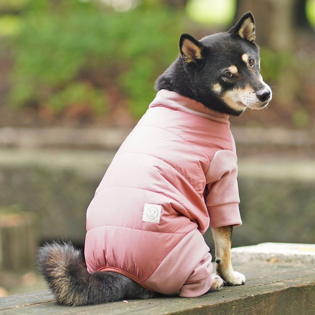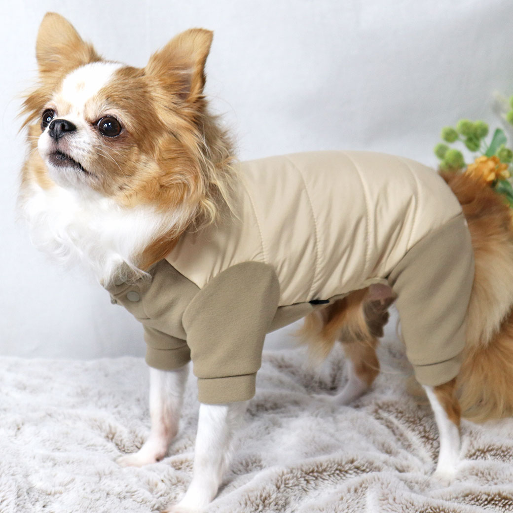 中綿入りのあたたかい冬用の防寒カバーオール。 軽くて暖かい愛犬用つなぎは寒がりな子にピッタリ。