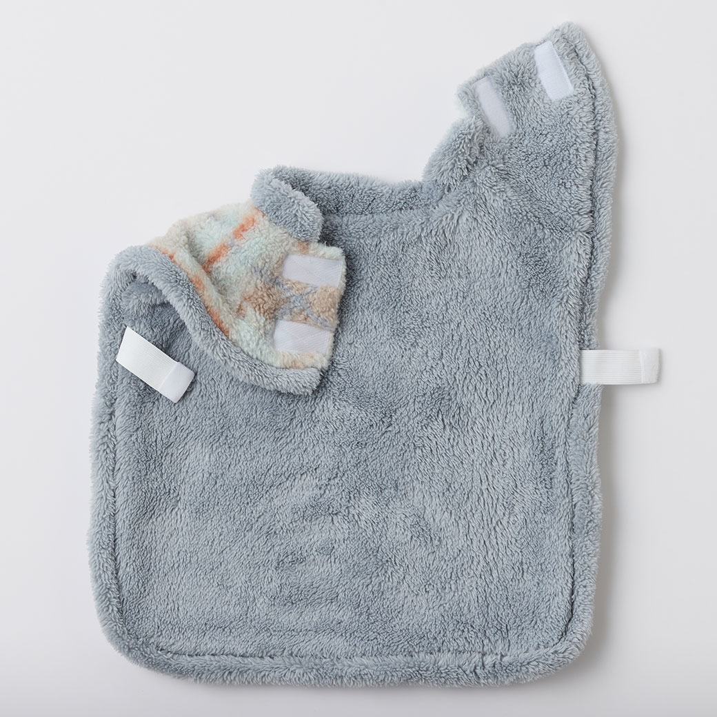 首元は面ファスナー、お腹周りはゴムひもと面ファスナーで留められるようにしました。全て開閉が可能なので、着脱が簡単なのに、動いても脱げにくい仕様です。