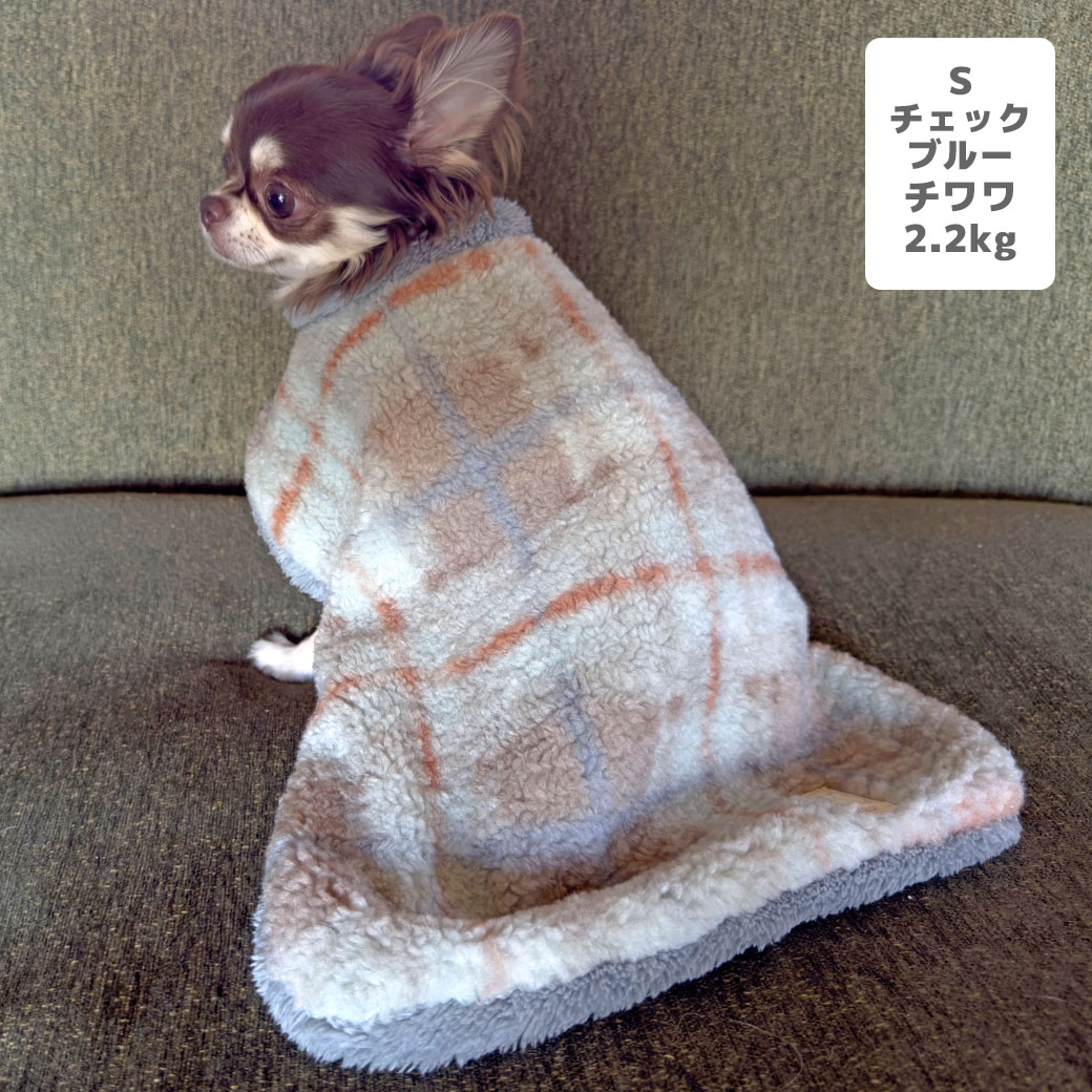 チワワ2.2kg(首18.5/胴30/丈30cm)のピクルスくんはチェックブルーのSを着用