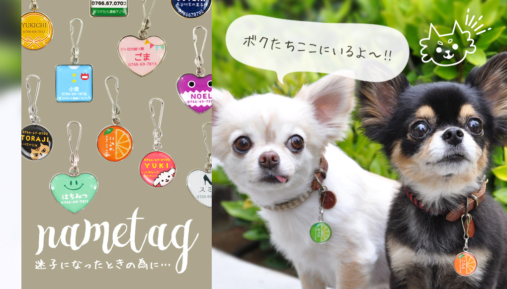 お名前・電話番号等を自由に入れることができる迷子札をつけておけば、万が一、愛犬・愛猫が迷子になったときでも安心です。