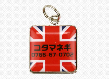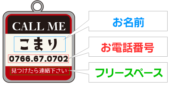 小さな角丸の四角いプレートに可愛い絵柄が入っていて、一見迷子札には見えないくらい、とってもオシャレです! 絵柄の中に、ワンちゃんの名前や電話番号などを入れて、貴方だけの1枚をお作りします。