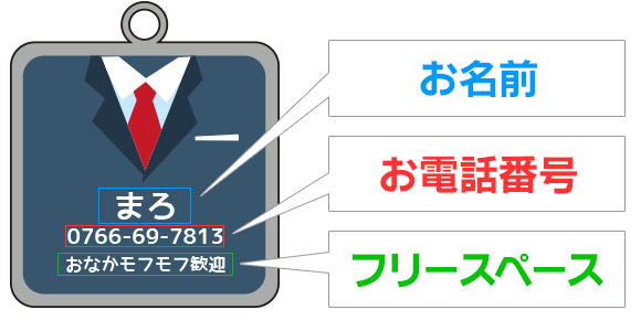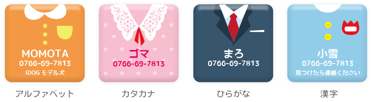 愛犬・愛猫が万が一、迷子になったときのために… iDogオリジナル柄のかわいい迷子札はいかがですか。小さな角丸の四角いプレートに可愛い絵柄が入っていて、 一見迷子札には見えないくらい、とってもオシャレです。絵柄の中に、ワンちゃんの名前や電話番号などを 入れて、貴方だけの1枚をお作りします。