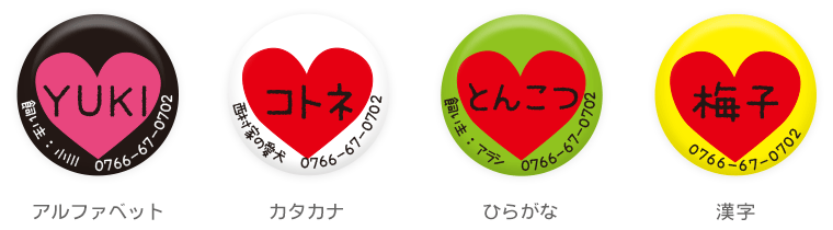愛犬・愛猫が万が一、迷子になったときのために… iDogオリジナル柄のかわいい迷子札はいかがですか♪ 小さなコイン型の丸いプレートに可愛い絵柄が入っていて、 一見迷子札には見えないくらい、とってもオシャレです! 絵柄の中に、ワンちゃんの名前や電話番号などを 入れて、貴方だけの1枚をお作りします。