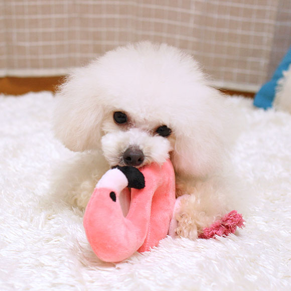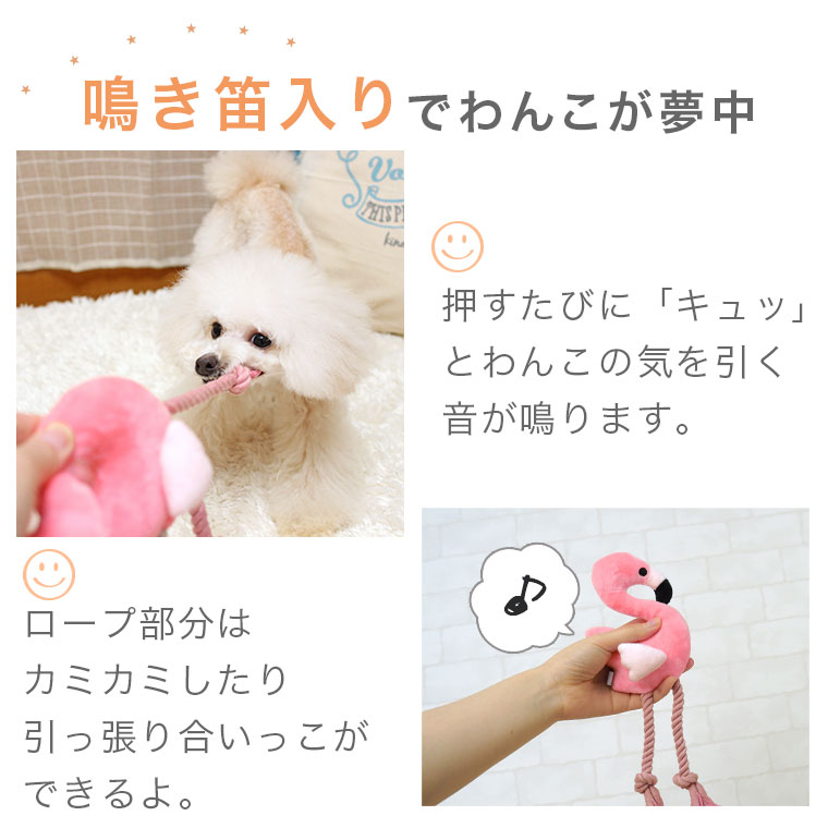 フラミンゴ型の犬用布製TOY。 鳴き笛入りで楽しいぬいぐるみタイプのオモチャです。
