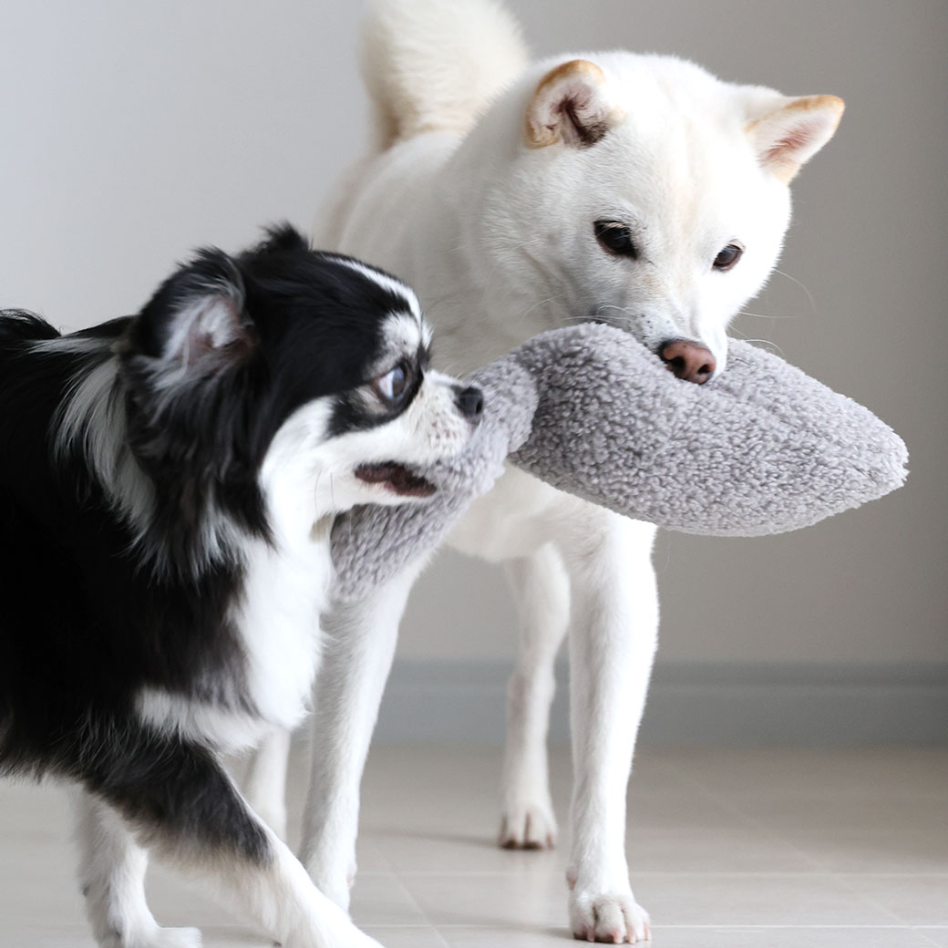 豆柴6.0kg(首31/胴45/丈33cm)のラテちゃんはストームグレーをティノちゃんと引っ張りあい