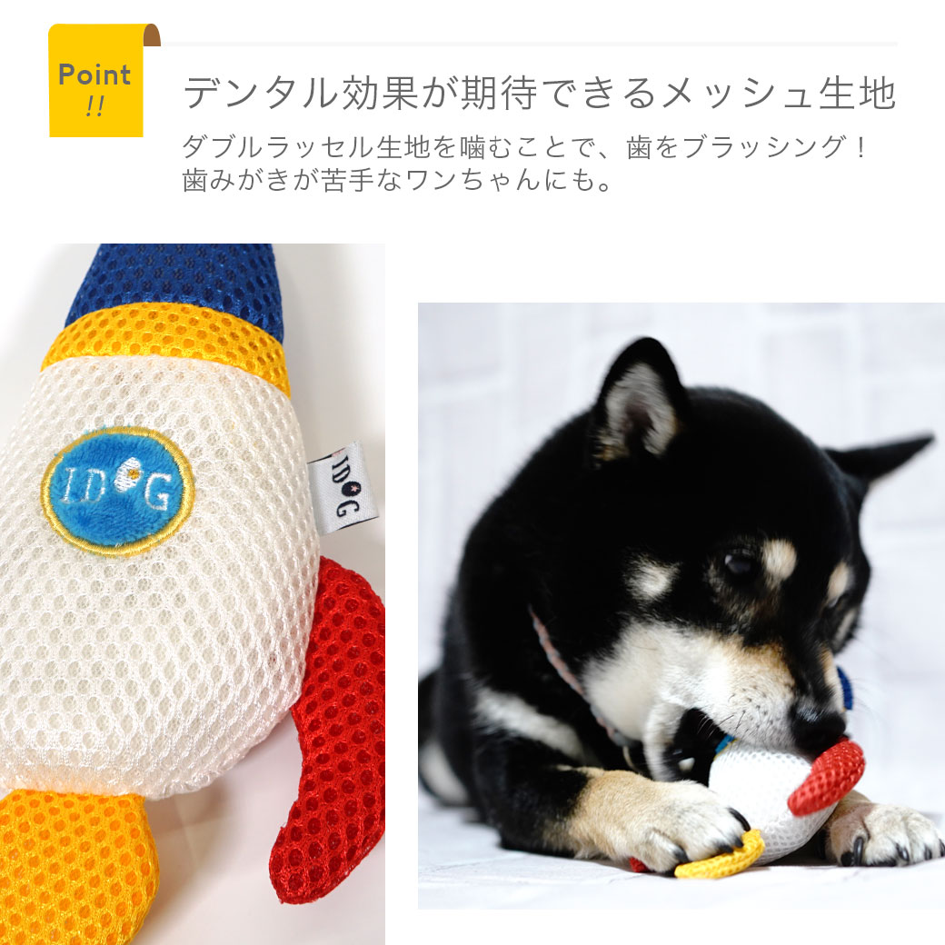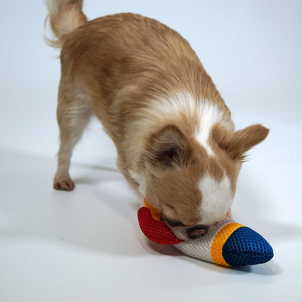 ロケット型の布製おもちゃ。鳴き笛とカシャカシャ入りでワンコも夢中に。