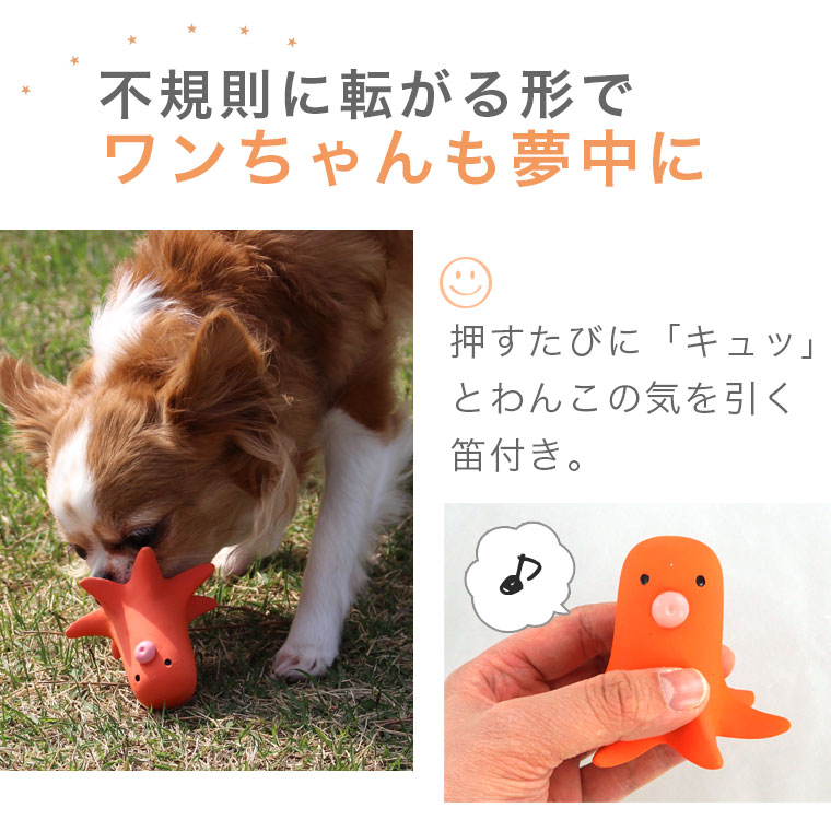 小さな子が噛みやすいように柔らかめに仕上げました。 噛むとキューキューと音が鳴り、一人遊びはもちろんトレーニングなどにもピッタリな小型犬向きのおもちゃです。