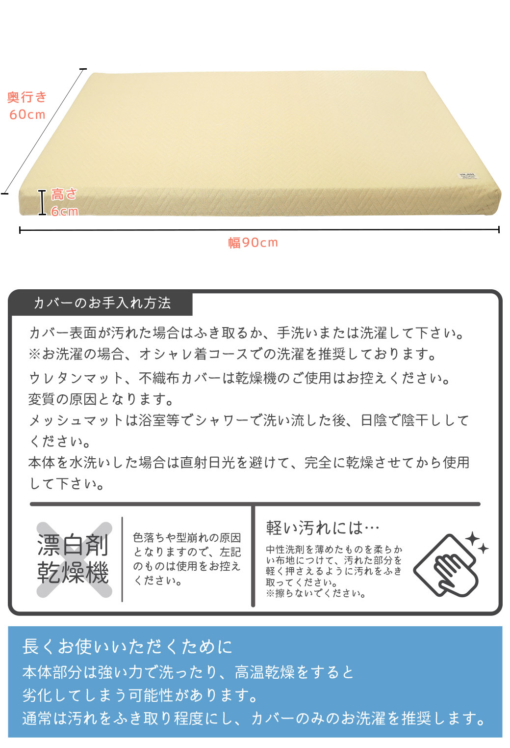 ※ウレタンマット・カバー類は手洗いまたはオシャレ着コースでのお洗濯推奨:陰干し※ウレタンマット、不織布カバーは乾燥機のご使用はお控えください。変質の原因となります。
