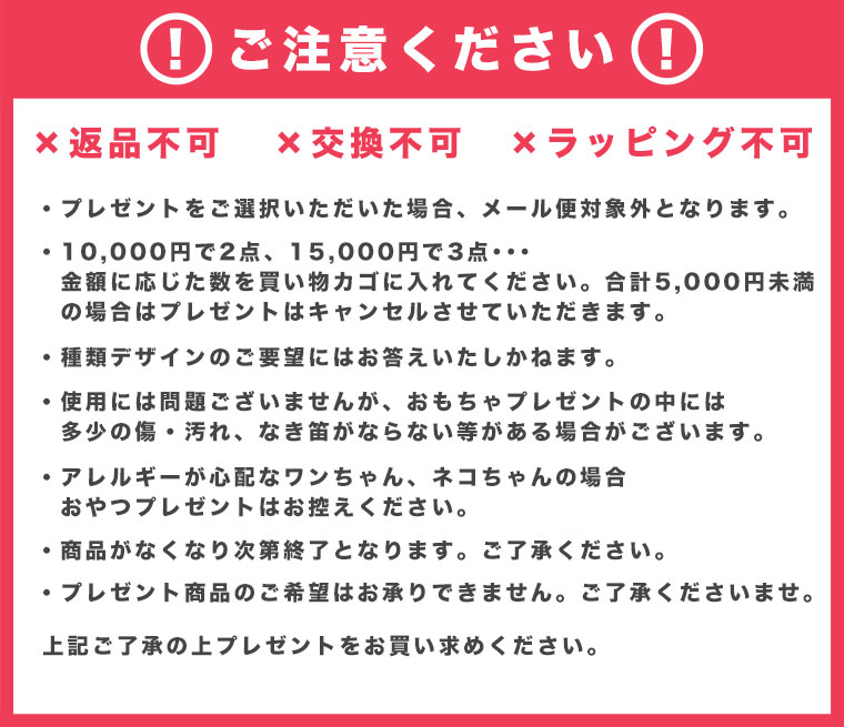 5000円以上のご購入でおやつorおもちゃをプレゼント。デザインやカラー、種類や味などはおまかせください。
