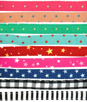 ゴム付きで何かに引っ掛かってもびよ~んと伸び、さらに安全バックル使用で強い力が加わると首輪がパチンと外れてくれます。 薄いナイロンのベルト芯を綿100%の布でくるんでいるので、とっても軽くて柔らか、しかも丈夫です。
