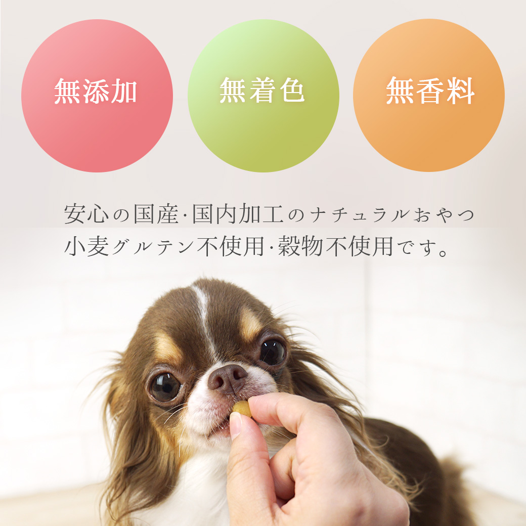 安心の無添加、無着色、無香料のナチュラルおやつ。 国産素材を国内工場で加工した、こだわりの犬用おやつ