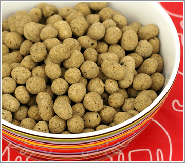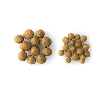 フードの粒はコロコロとした楕円系で大きさは不揃いです。サクサクとした食感でどんなわんこも美味しく食べられます。