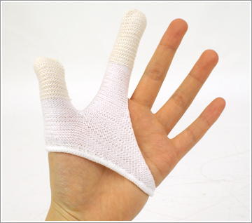 ゴム部から手を通し、親指と人差指に「ブラシ部」をはめ、「ストッパー」を中指を・薬指・小指を通して装着します。