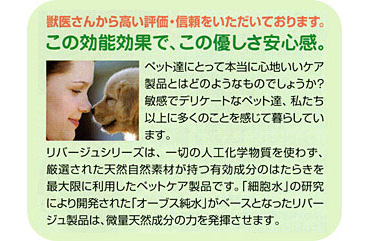 ペット用のケア製品は、強い菌剤が入っているので子供のいる我が家では使えずに困っていました。でもリバージュシリーズは、臭いもないし子供の手肌に付いても、安心安全。特にブラッシュアップスプレーは、ダニよけにもなるし、シャンプーの回数も減らせて驚きの効果です。