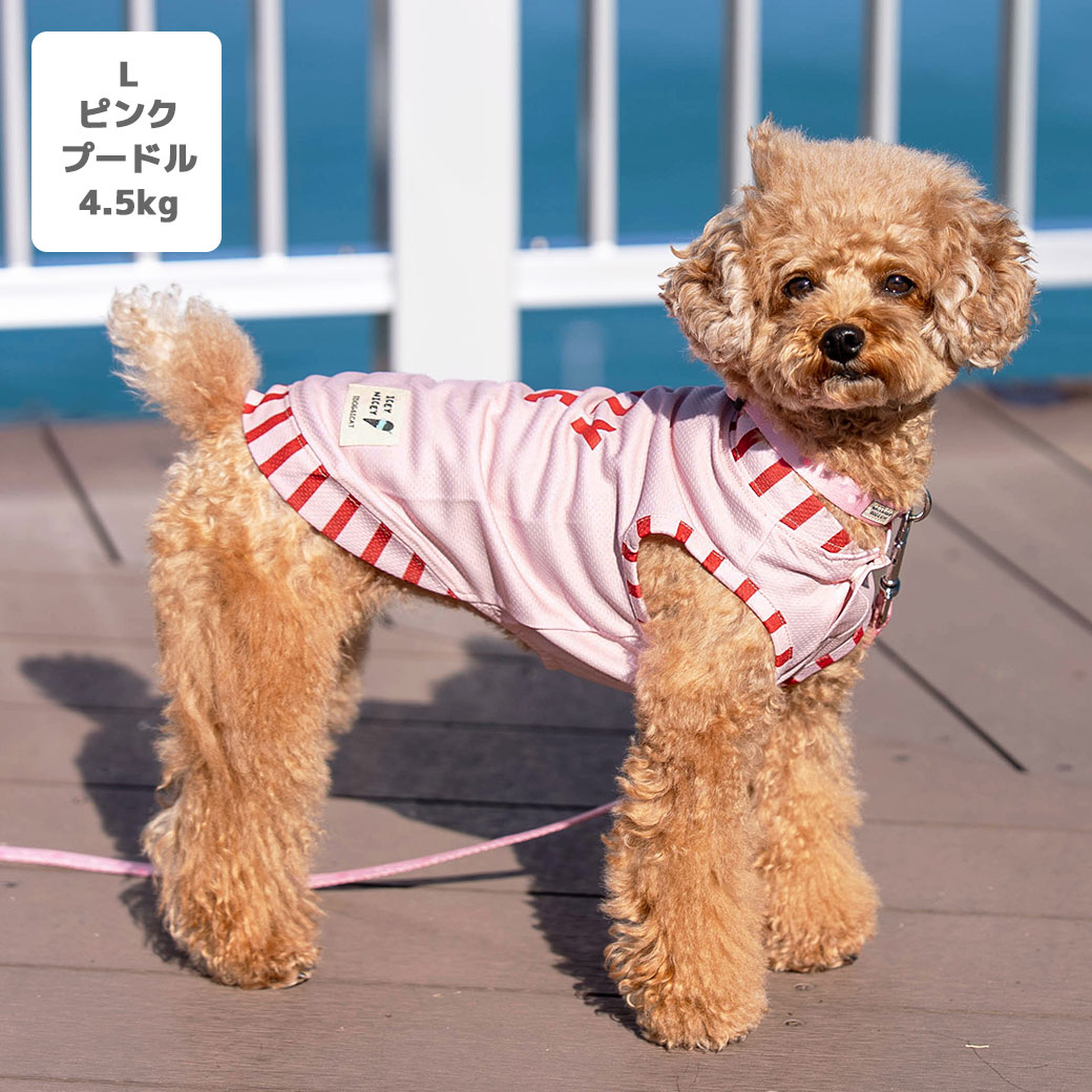 トイプードル4.5kg(首26/胴40.5/丈30cm)の里梨衣ちゃんはピンクのLを着用
