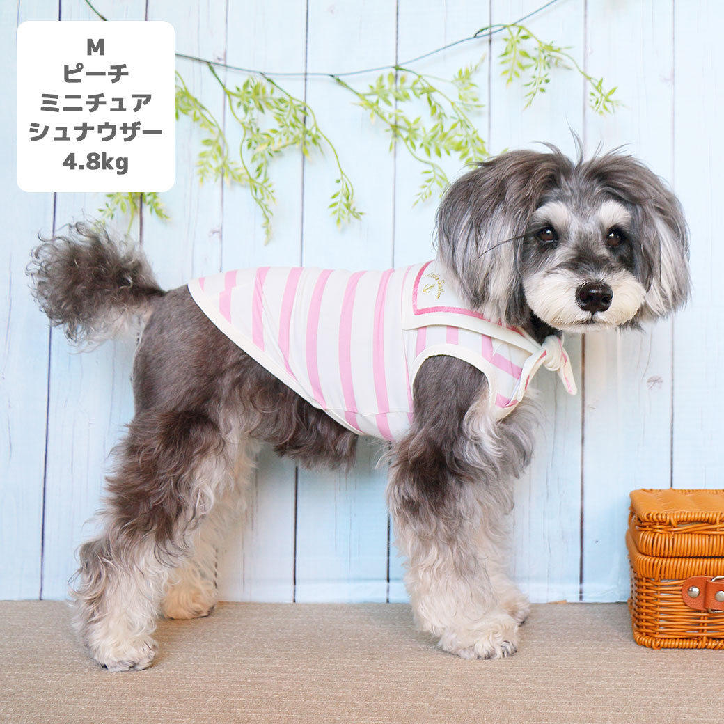 ミニチュアシュナウザー4.8kg(首22/胴39/丈29cm)のあろあちゃんはピーチのMを着用