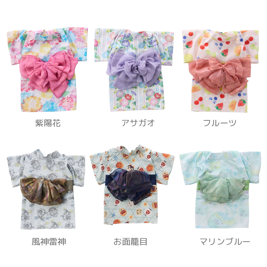 - 紫陽花/アサガオ/フルーツ:ポリエステル100% 風神雷神/お面籠目/マリンブルー:ポリエステル95%、ポリウレタン5% 帯:ポリエステル100%