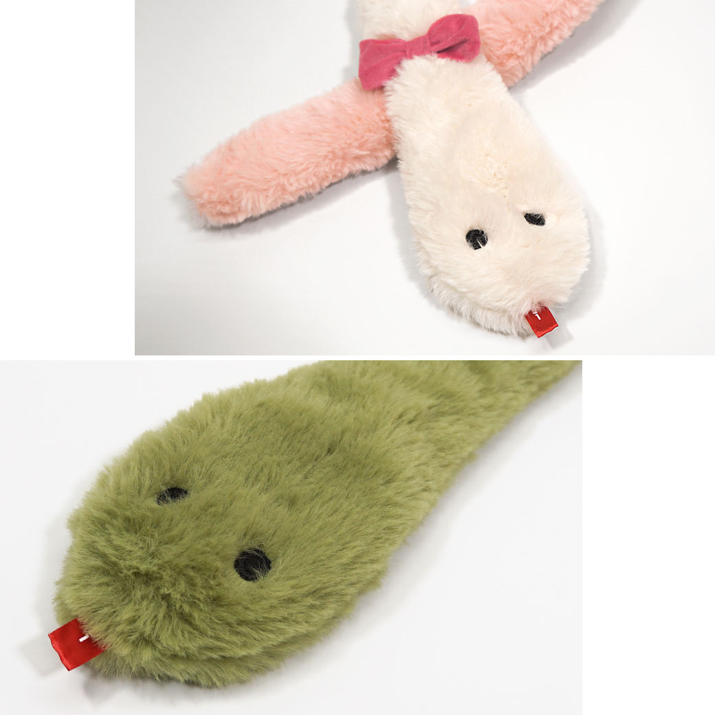 手触りが心地良いファー素材を使用しました。端の方にはぱっちりお目々の刺繍がしてあります。赤いピスネームはへびさんの舌のようで可愛いポイントになっています。