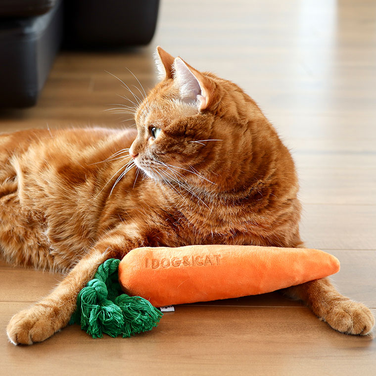 にんじんモチーフの布製の犬用・猫用のおもちゃです。 「IDOG&ICAT」の刺繍入り。 ヘタ部分はロープになっており、カミカミしたり引っ張り合いっこができます。