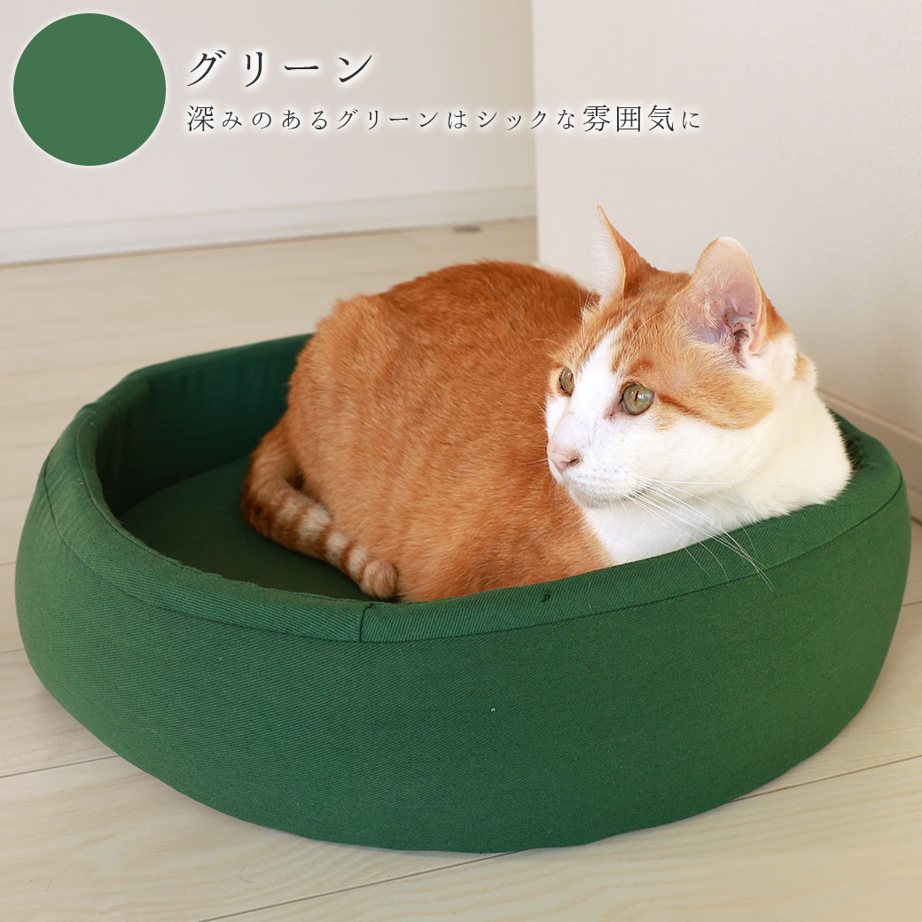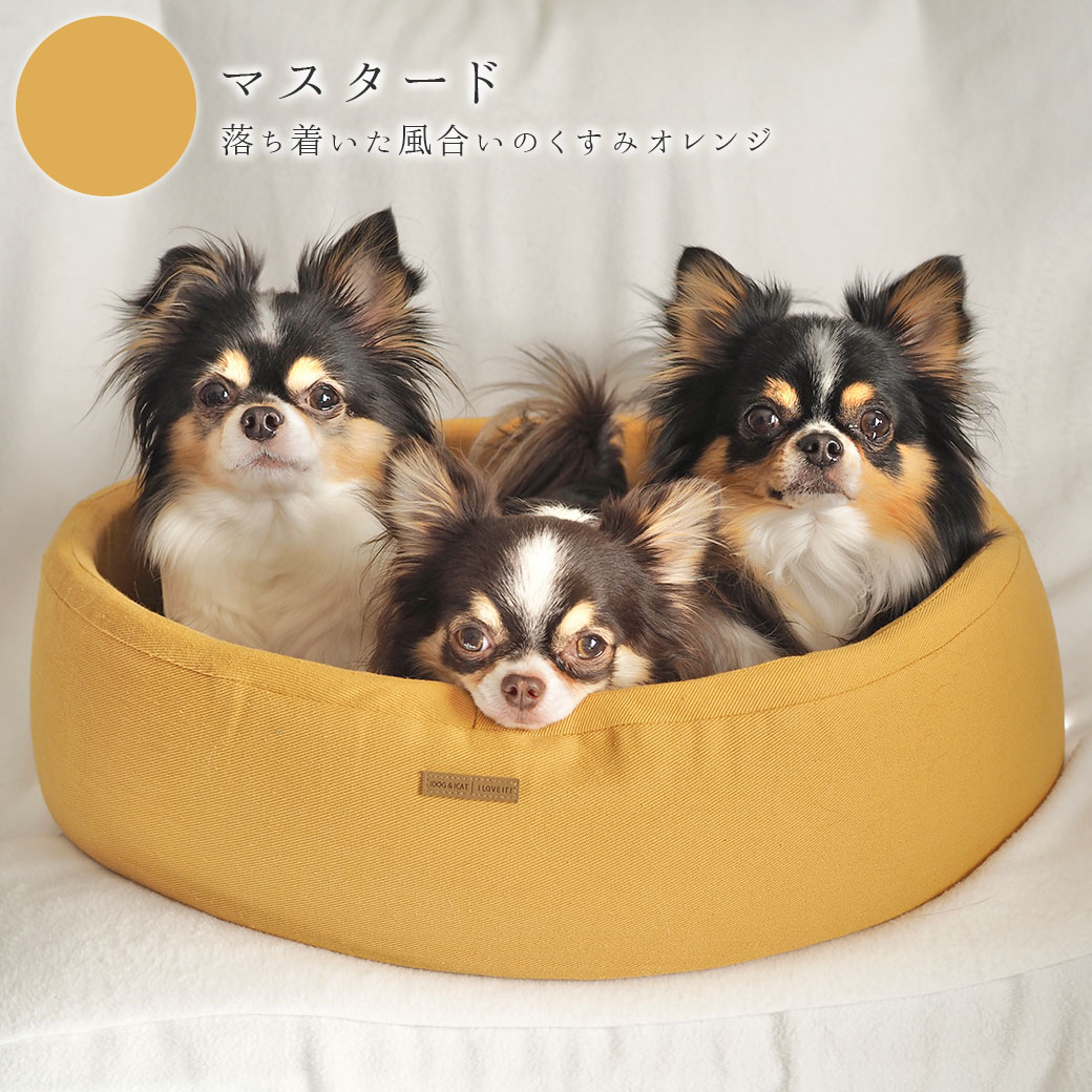 シンプルなラウンド型のペット用ベッドです。 お部屋のインテリアに馴染むシックなカラーとツイル生地がオシャレ。
