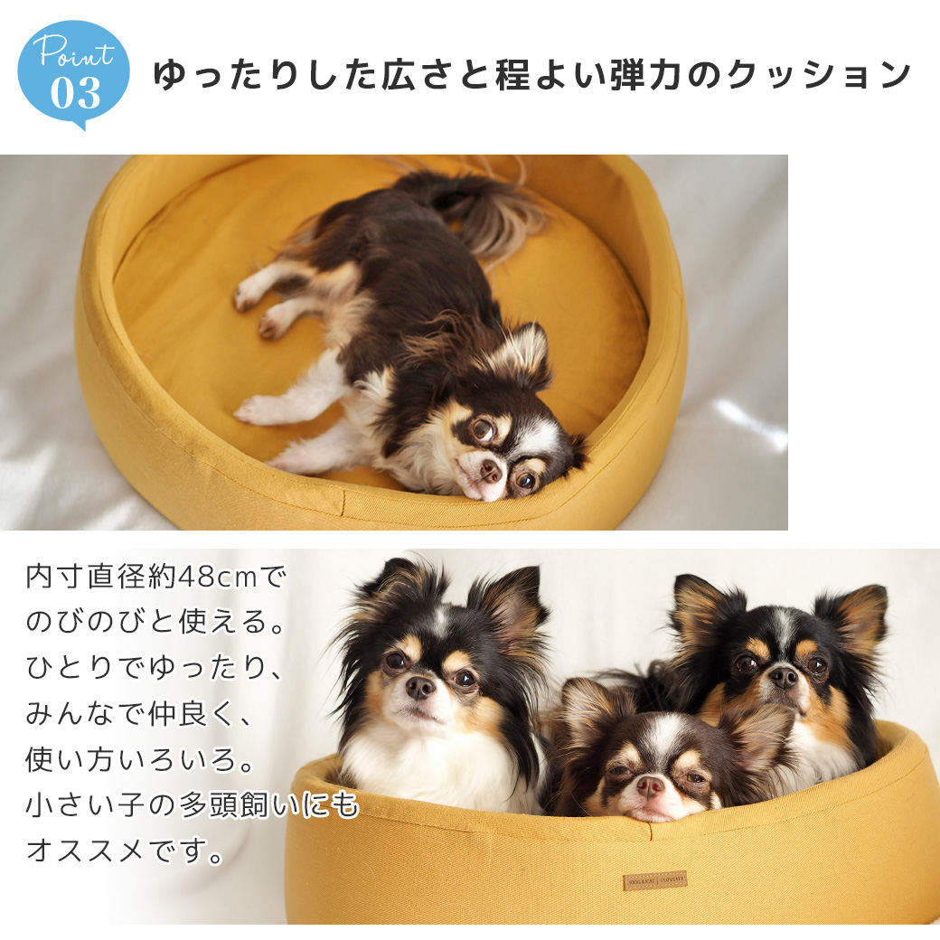 丸まって寝る習性のあるワンちゃん、ネコちゃんの身体も包み込めるラウンド型ベッド。 内寸直径約48cmの広々とした空間は、ゆったり身体を伸ばして眠りたいペットにもオススメ。