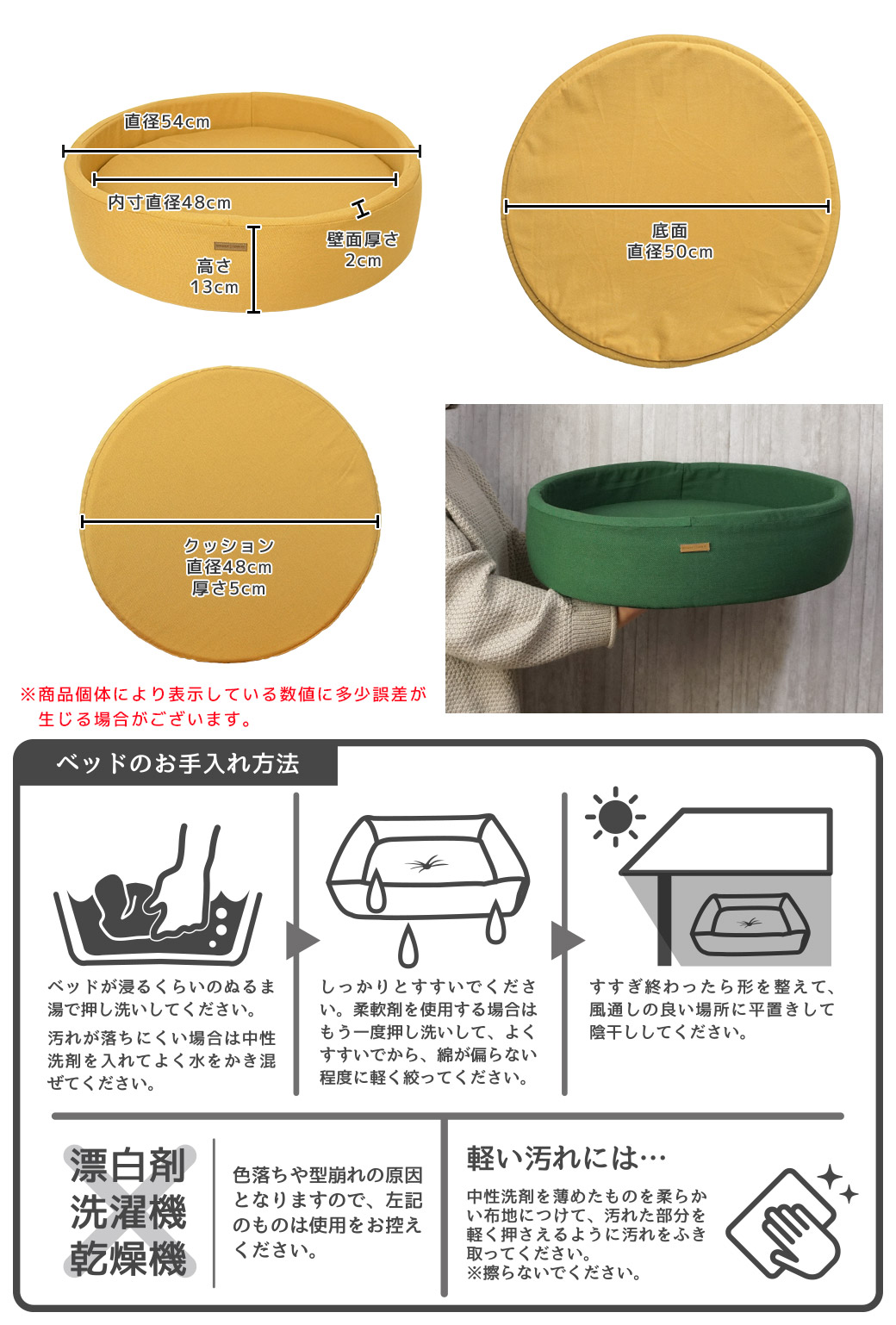 - (約)直径54cm×高さ13cm / 内寸:(約)直径48cm / 壁面厚さ:約2cm / クッション:直径48cm×厚さ5cm / 底面:直径約50cm