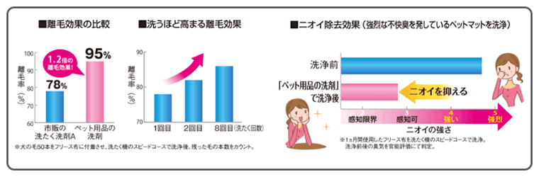 ペットのニオイ汚れを落とす専用洗浄成分配合。洗うたびに高まる離毛効果。