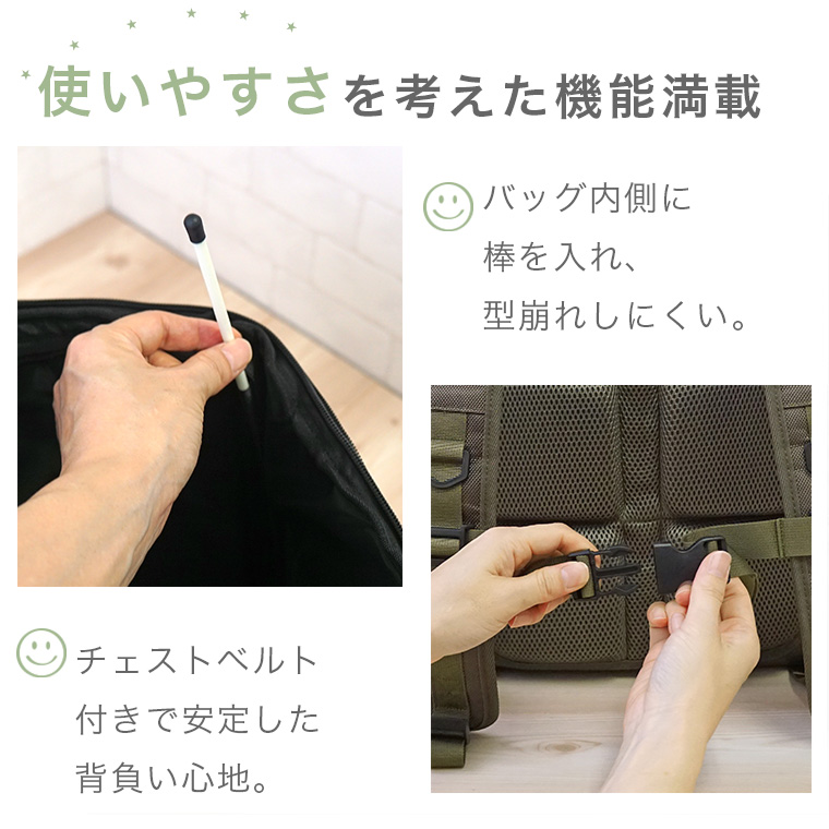 バッグの内側には棒を入れ、型崩れしにくく、より自立しやすい構造になっています。