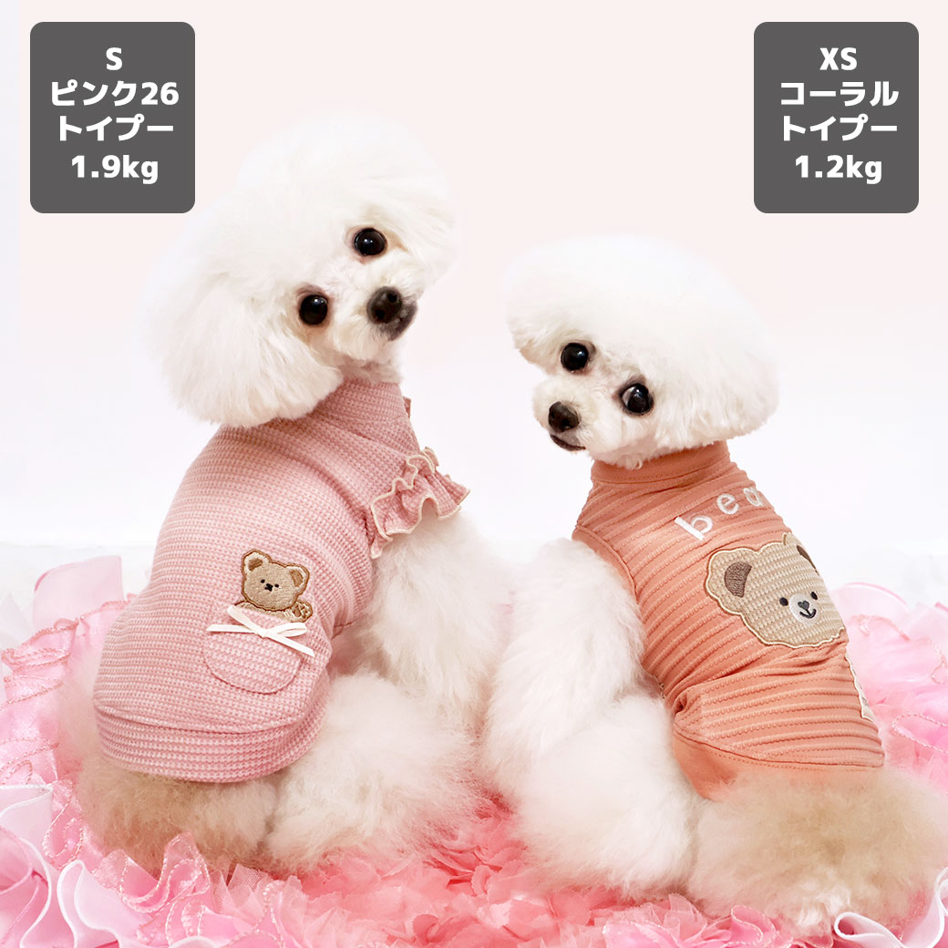 トイプー1.2kg(首15/胴26/丈19cm)のマユリちゃんはコーラルのXSを着用、トイプー1.9kg(首17/胴29/丈22cm)のメリナちゃんはピンク26のSを着用