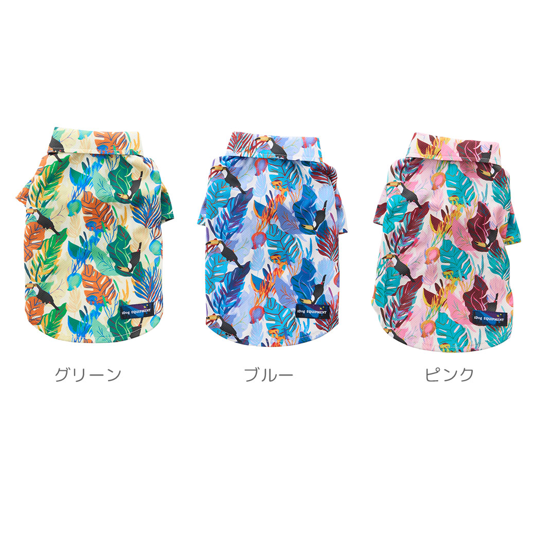 iDogオリジナルのカラフルなトロピカル柄が目を引く犬用アロハシャツです。