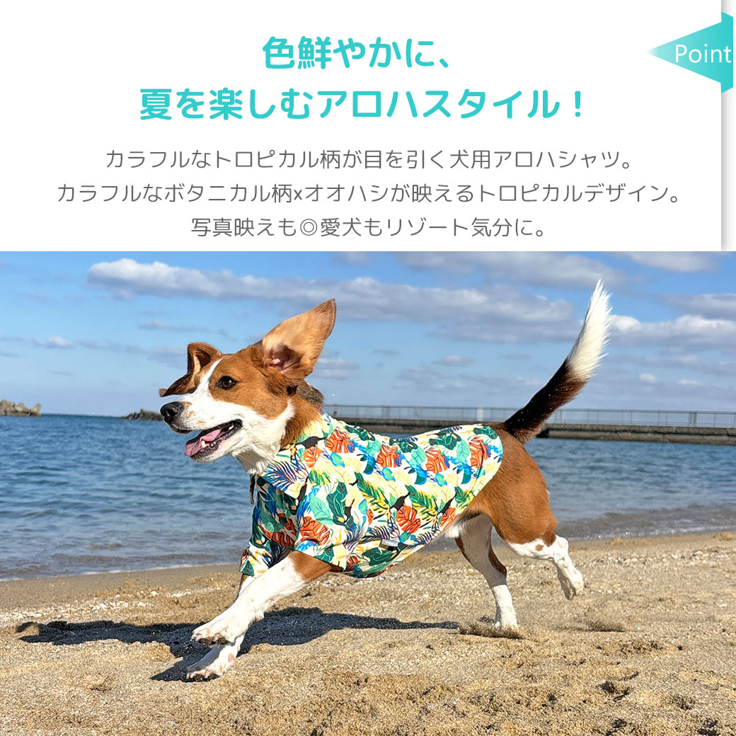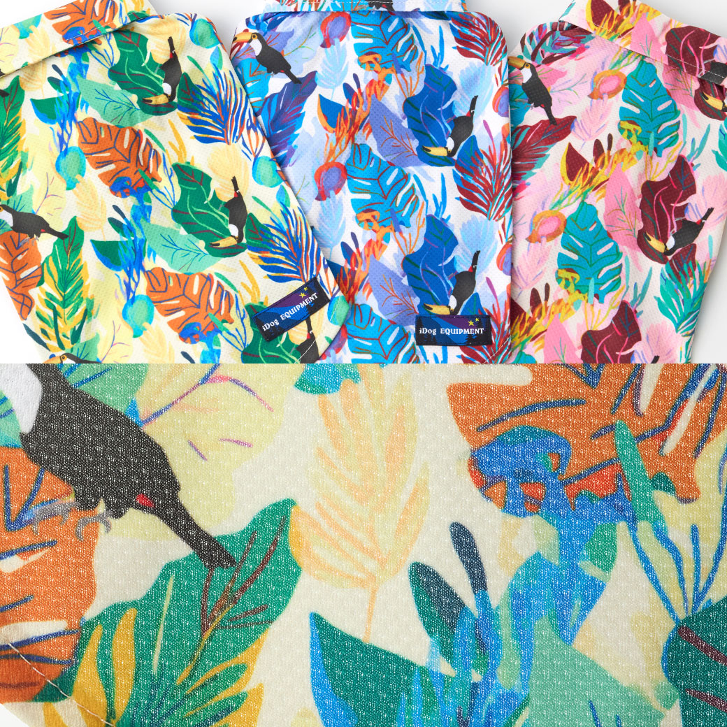 南国の雰囲気たっぷりのカラフルなボタニカル柄とオオハシが描かれた鮮やかなトロピカル柄で、写真映えもばっちり。愛犬もリゾート気分に。