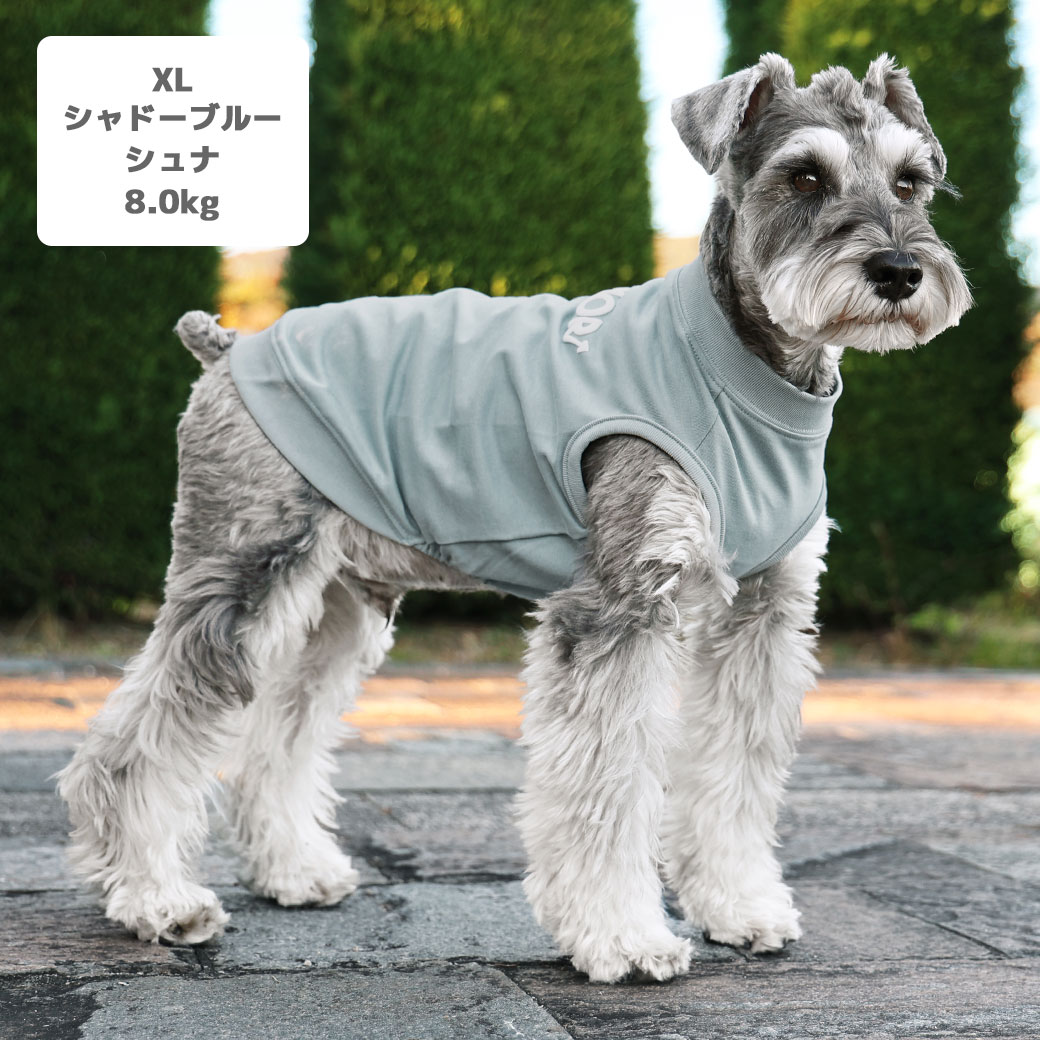 ミニチュアシュナウザー8.0kg(首30/胴48/丈37cm)のマハロくんはシャドーブルーのXLを着用