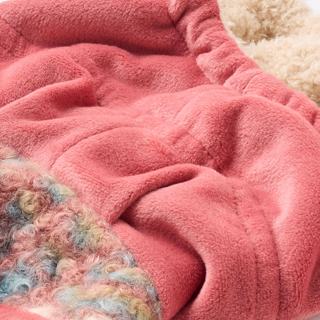 身頃の表はくるくるの素材感がかわいいファー素材、裏面は起毛した厚みのあるしっかりとした素材です。 フードは表地が手触りの良い少し光沢のあるフリース素材で、裏地は毛足の短いファー素材です。