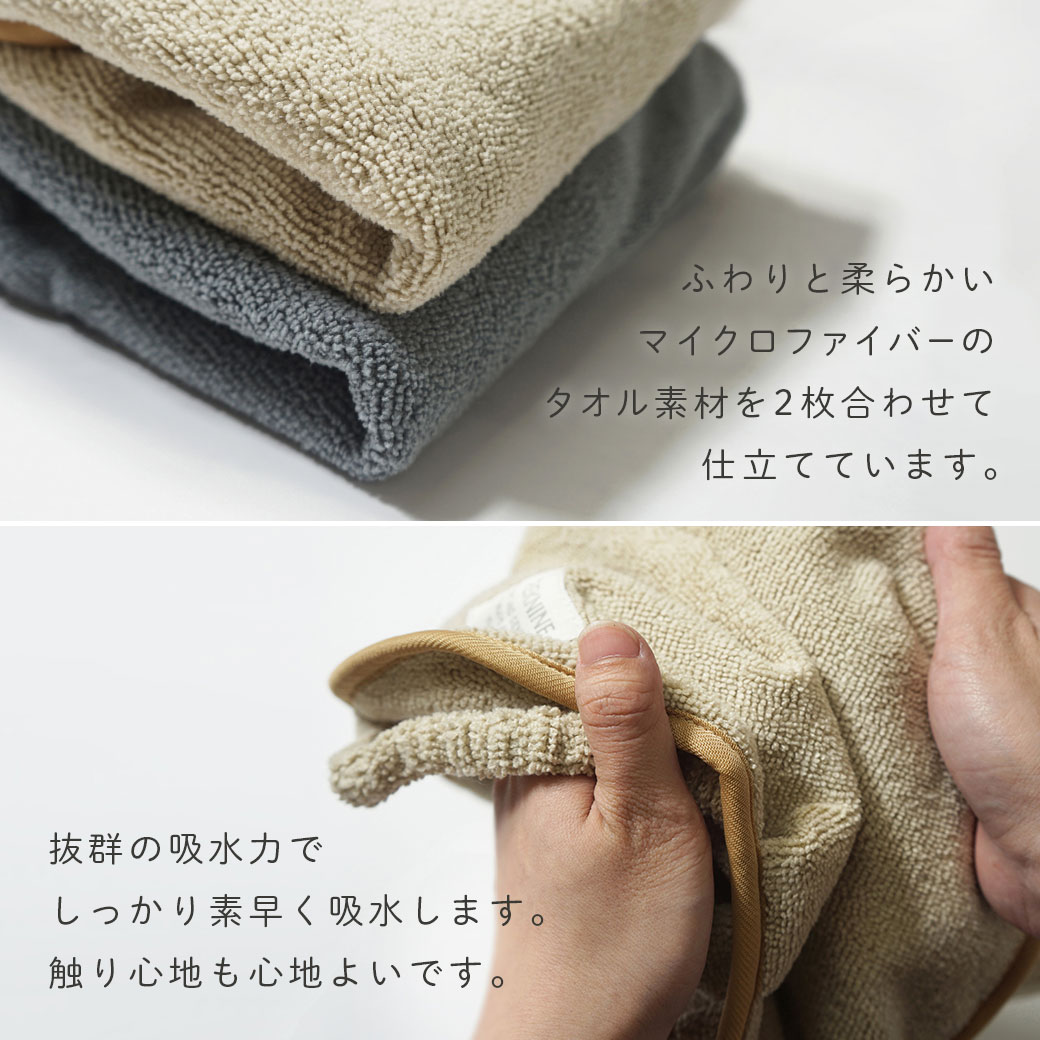 ふわりと柔らかいマイクロファイバーのタオル素材を2枚合わせて仕立てています。