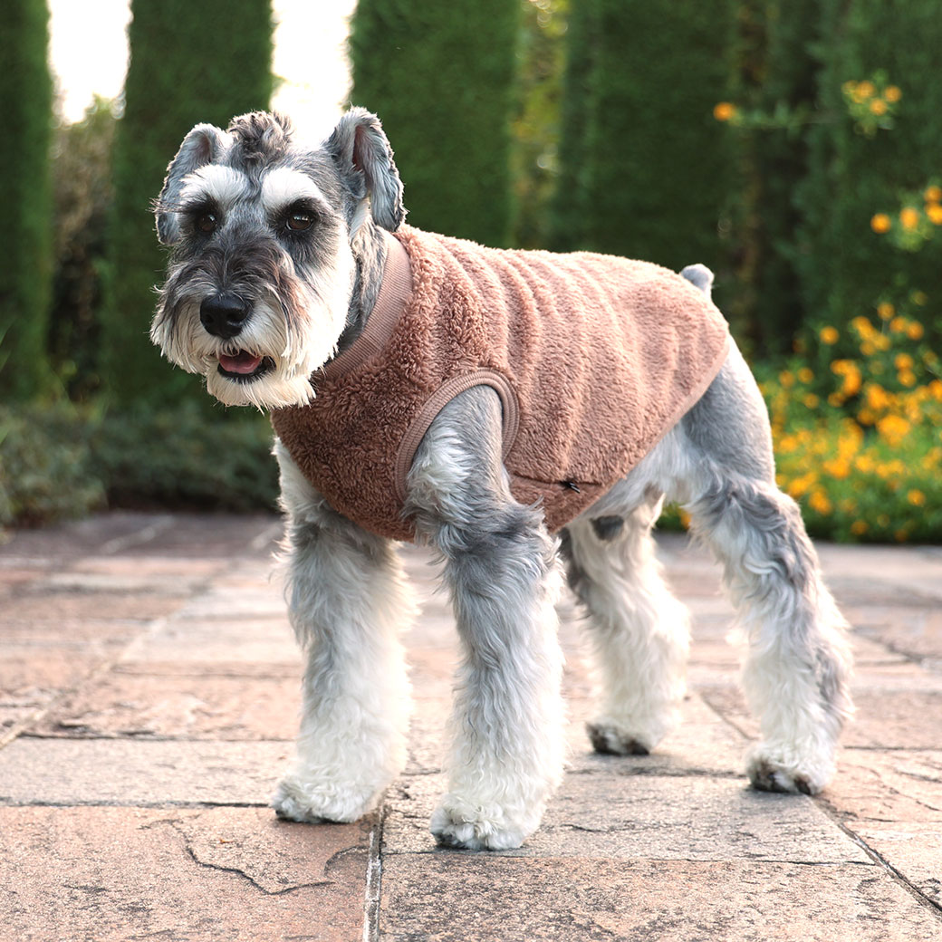 ミニチュアシュナウザー8.0kg(首30/胴48/丈37cm)のマハロくんはフォーンのXLを着用