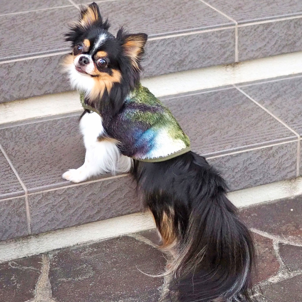 チワワ2.7kg(首23/胴35/丈26cm)のマルスくんはタイダイカーキ系のSを着用