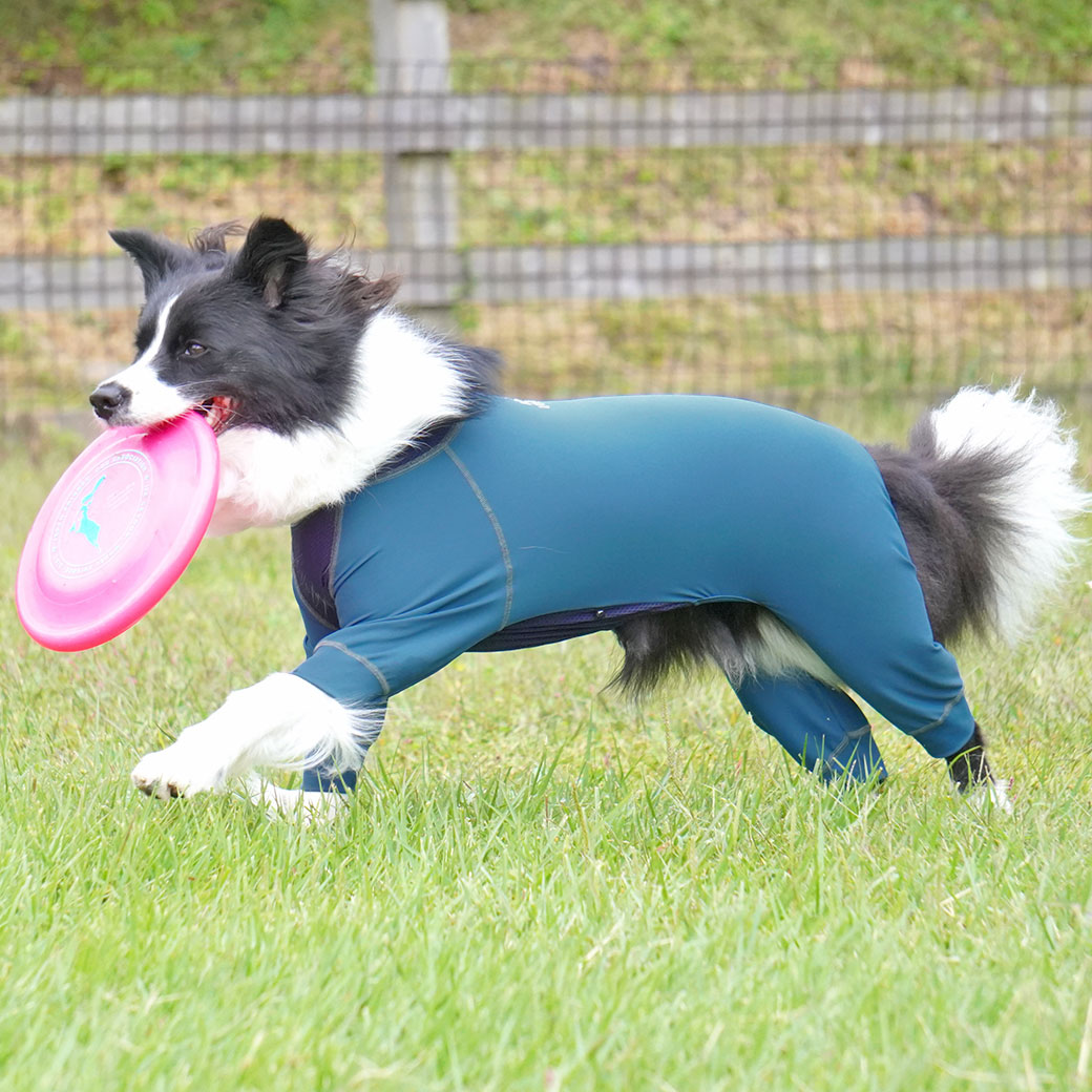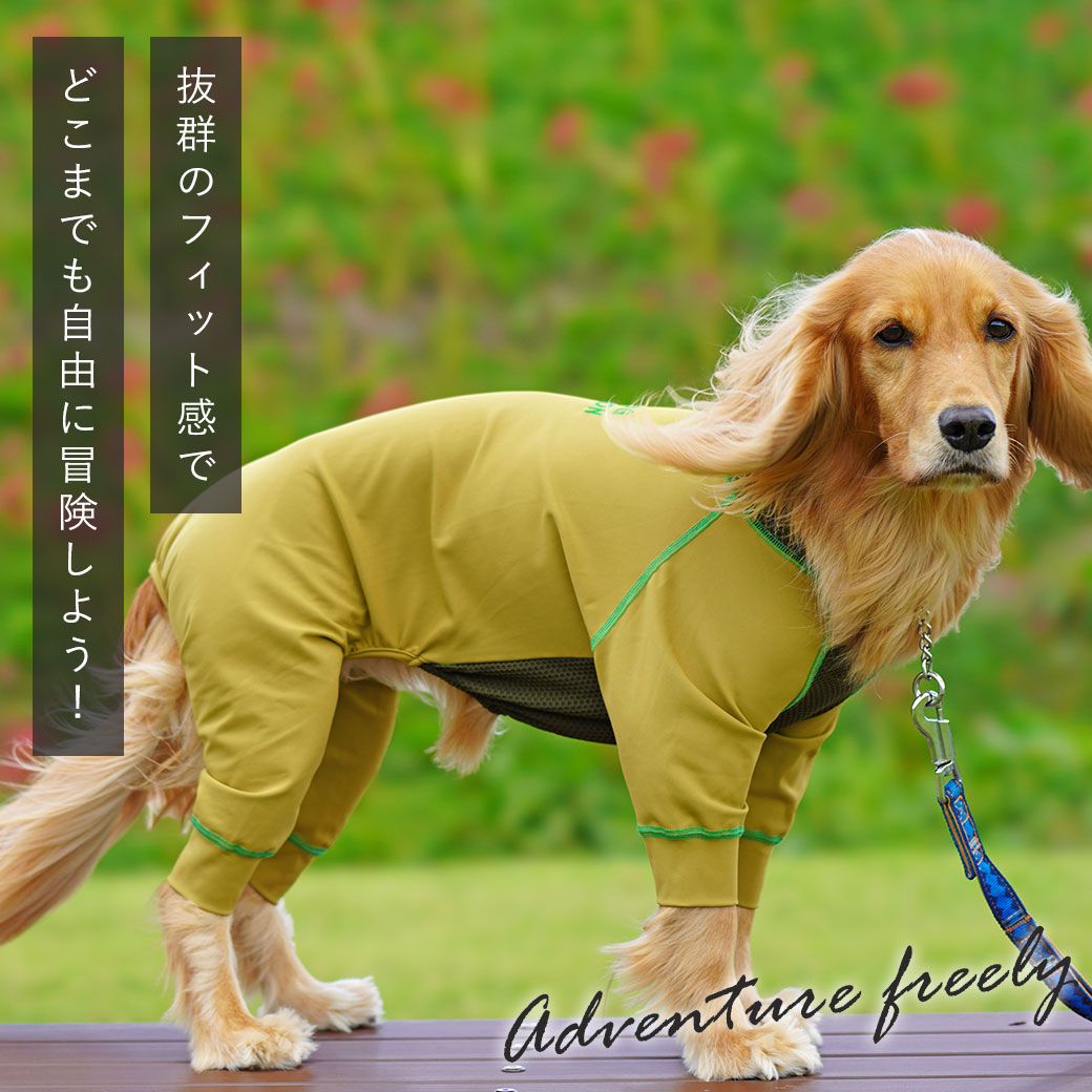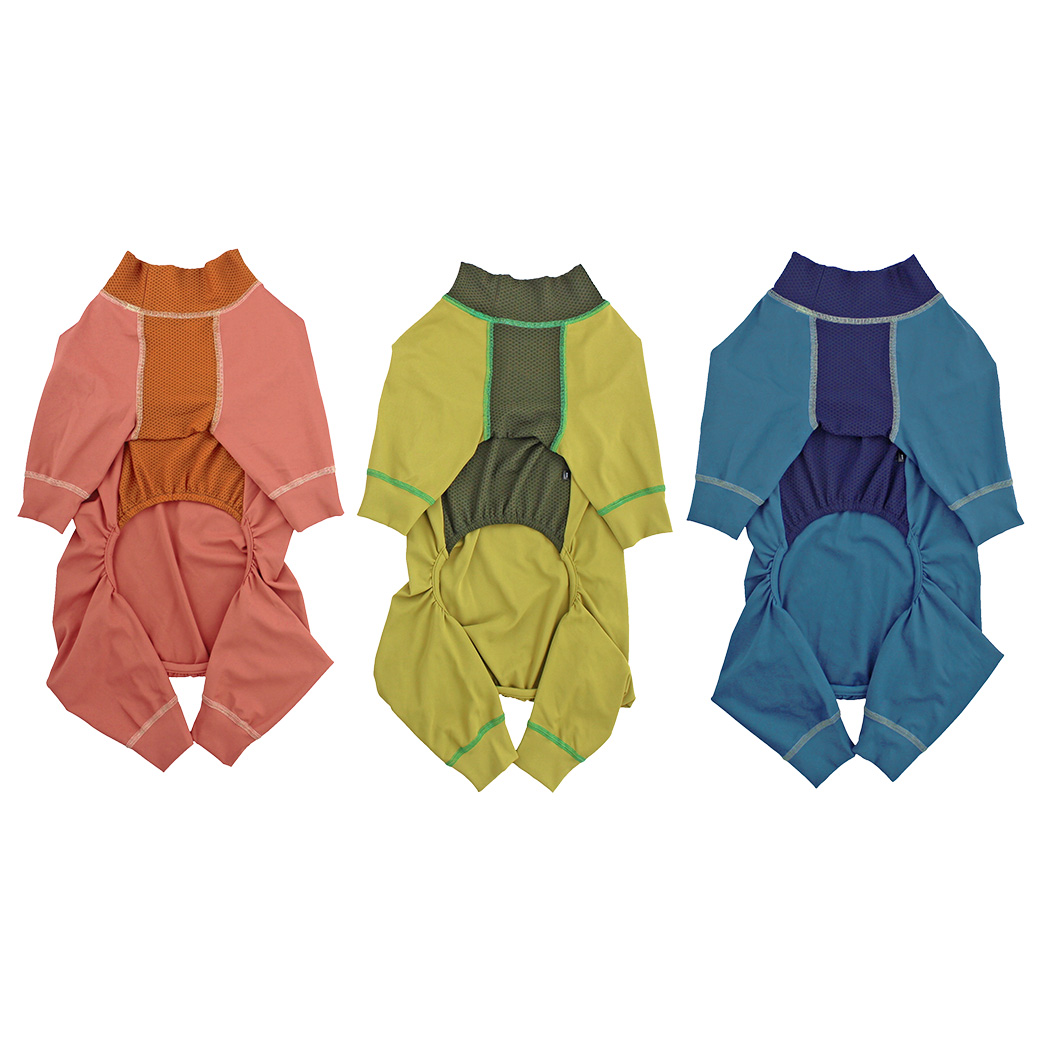 フィット感抜群の愛犬用つなぎ「ウルトラフィットドッグカバー」。 「こもりやすい」を解消するメッシュ切替の愛犬用カバーオール。