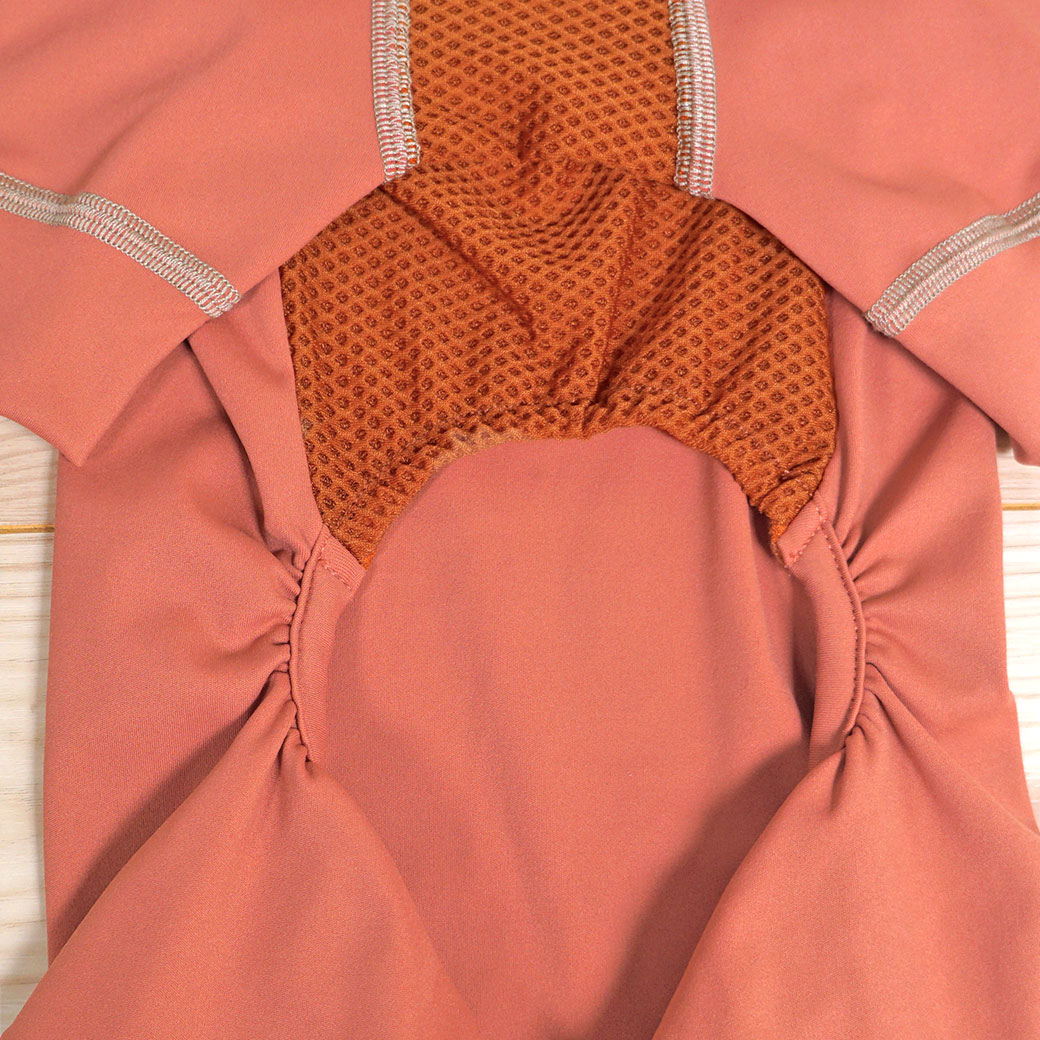濡れやすい首元や湿気がこもりやすいお腹側を快適に保つために、メッシュ素材で切り替えました。