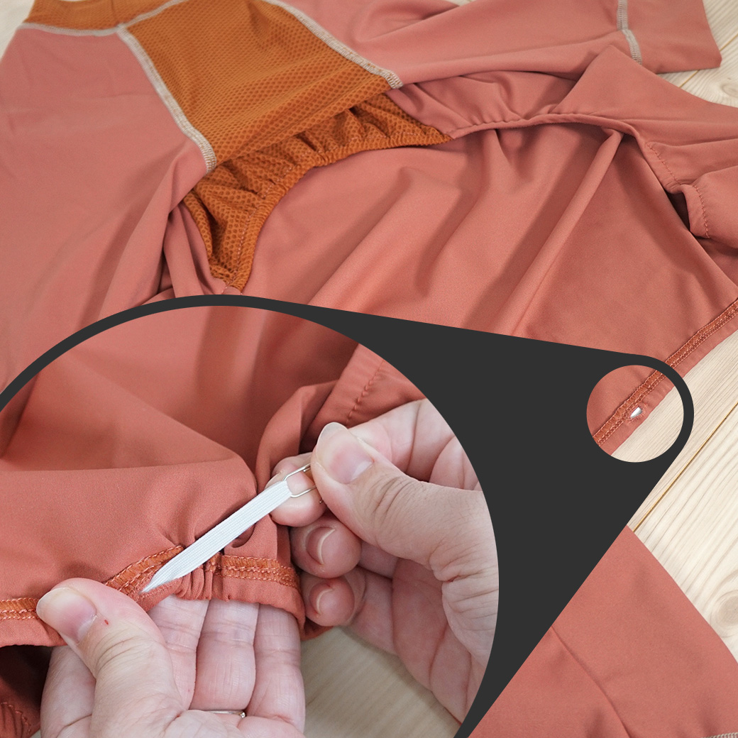 お尻部分に着丈を調整できるようゴムを入れました。