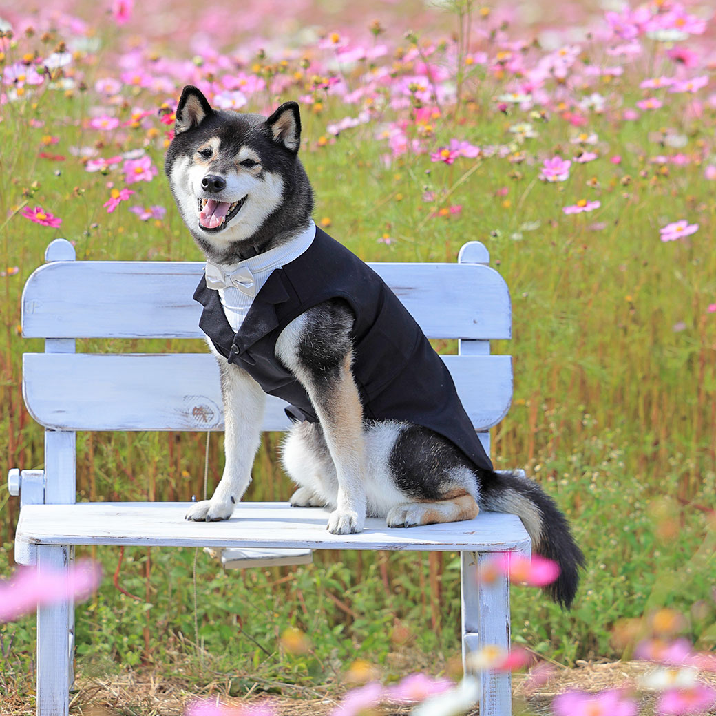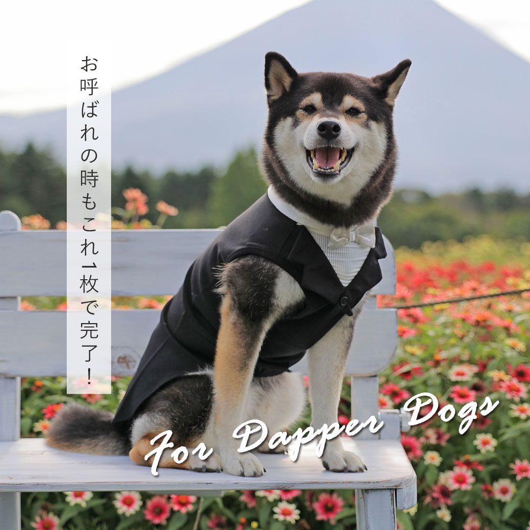 お呼ばれの時も1枚で様になる愛犬用タキシードタンク。