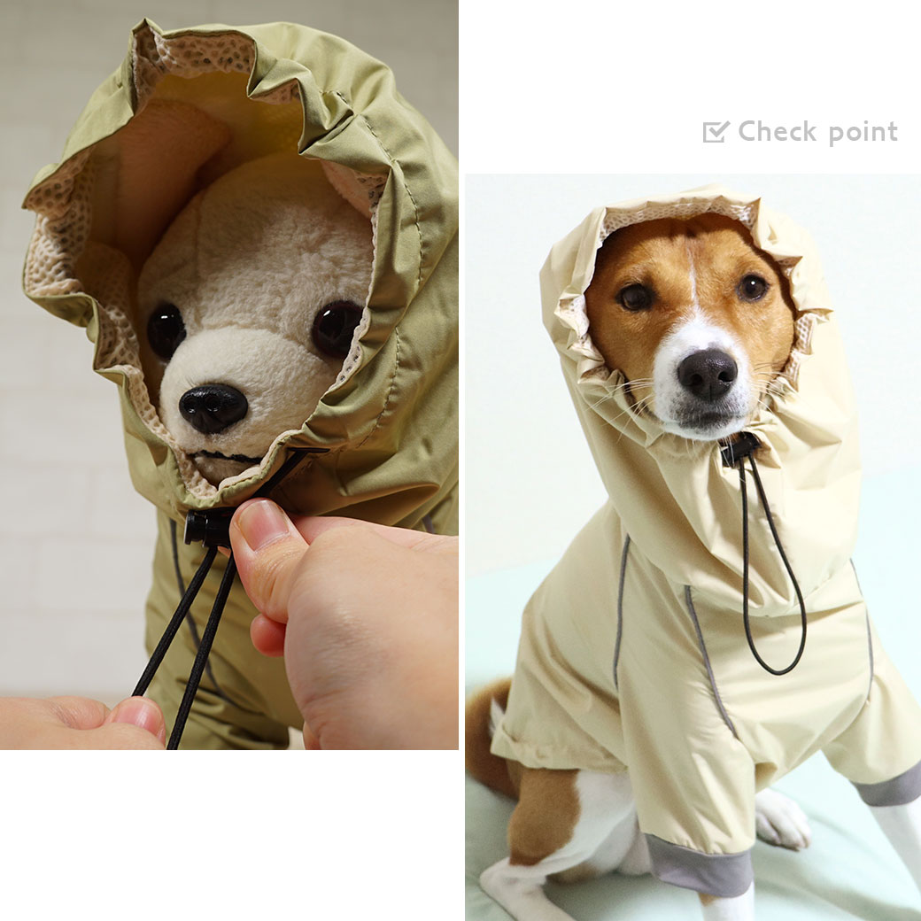 フードはスヌードタイプです。愛犬の頭に合わせてストッパーで調整してください。