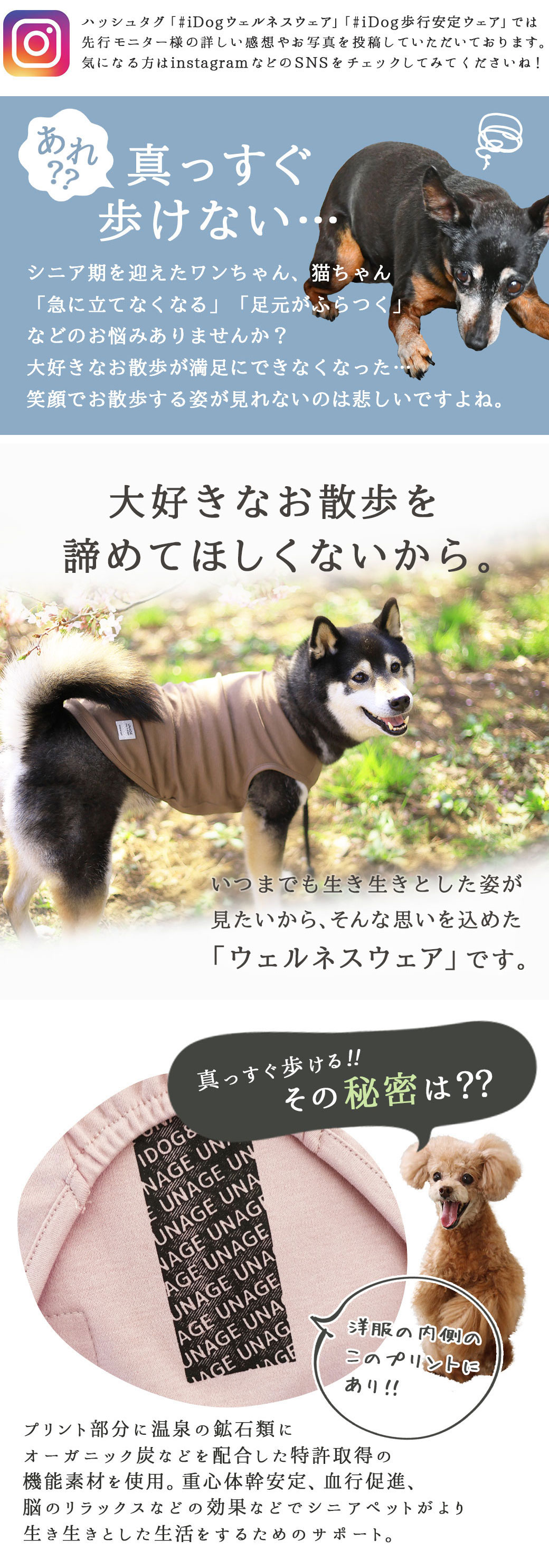 シニア期や病気のペットが快適に過ごせるように開発した新しい機能性ウェア「unage」(アンエイジ)シリーズです。 「IDOGウェルネスウェア」は高機能素材を固着したドッグウェアで、着用する愛犬・愛猫にリラックス状態、血流の促進、体幹安定効果による歩行時の転倒・ふらつきを予防する目的で企画しました。