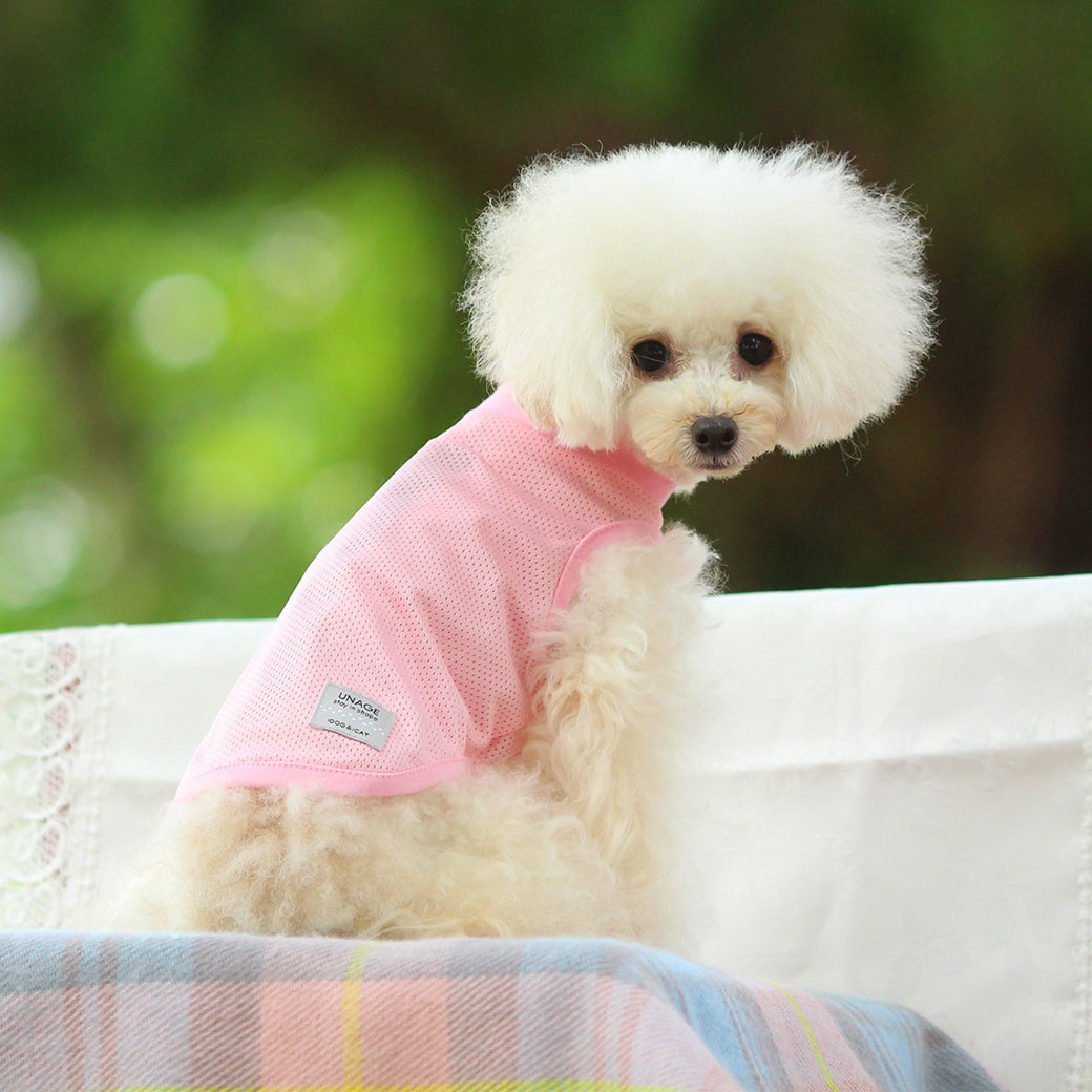 トイプー1.9kg(首17/胴29/丈22cm)のメリナちゃんはメッシュライトピンクのSを着用