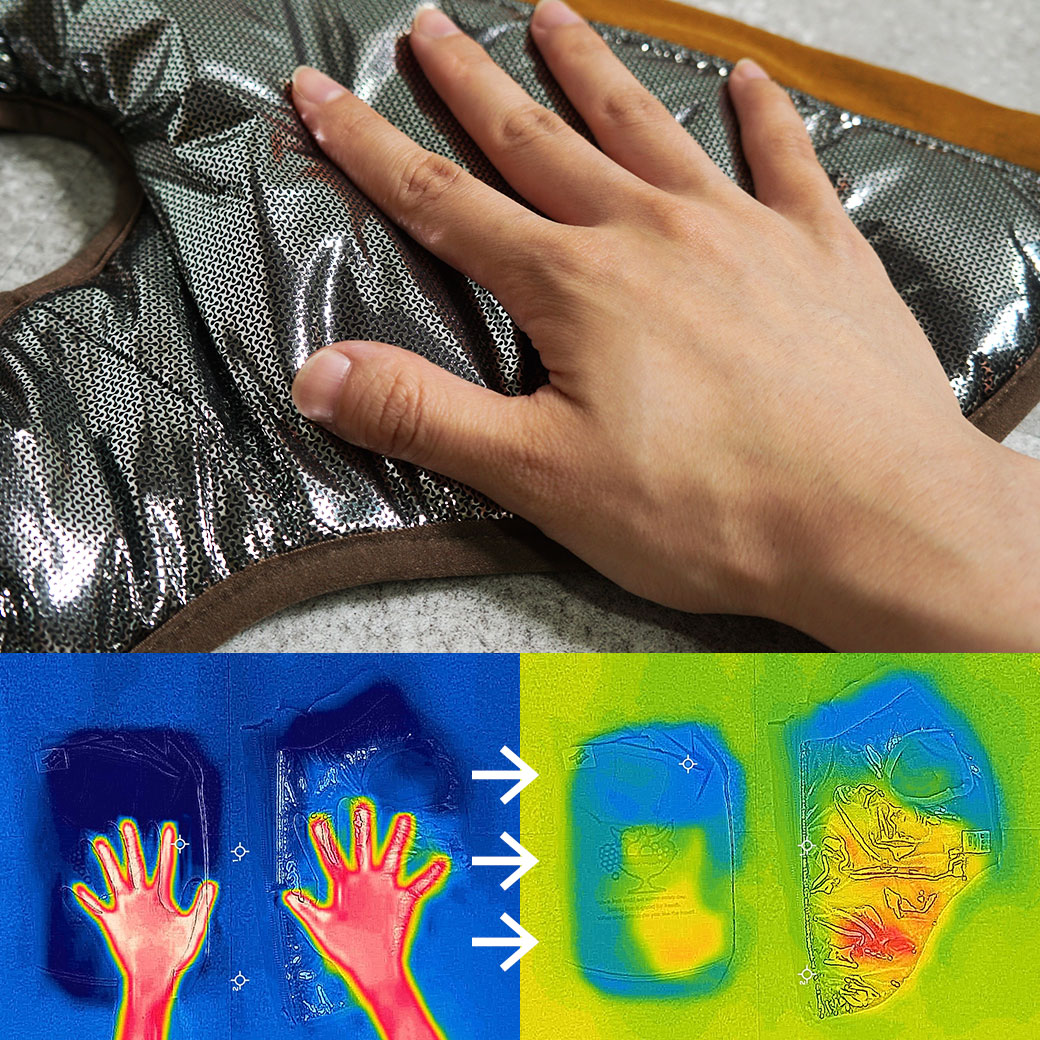 お洋服の裏面は熱反射性の高いアルミをプリントした素材を使っています。